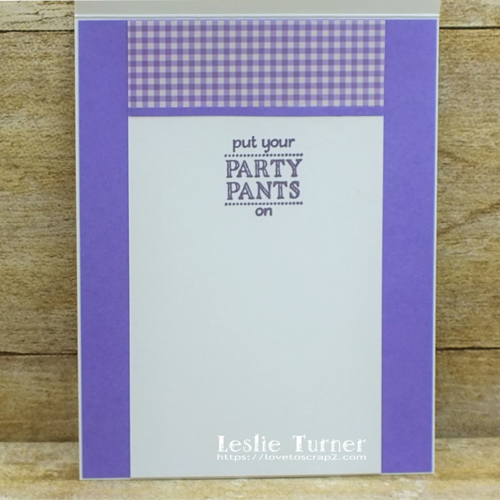 I adhered a panel of CutCardStock Pop-Tone Grape Jelly cardstock to the inside of the card base along with a narrower panel of Neenah Classic Crest 80# Solar White cardstock embellished with a wide strip of purple gingham and a narrow purple cardstock strip, and then stamped the sentiment in purple ink.