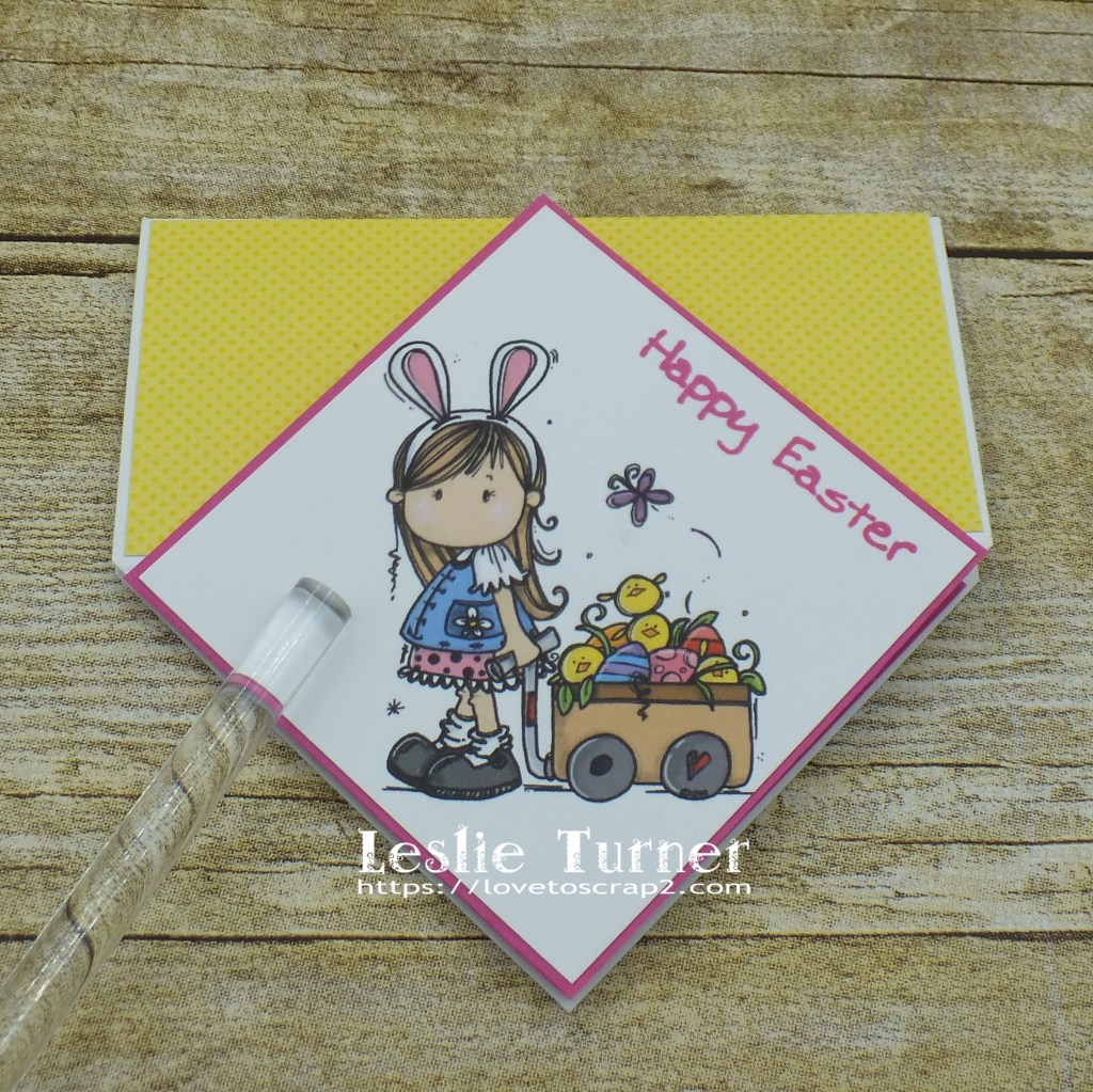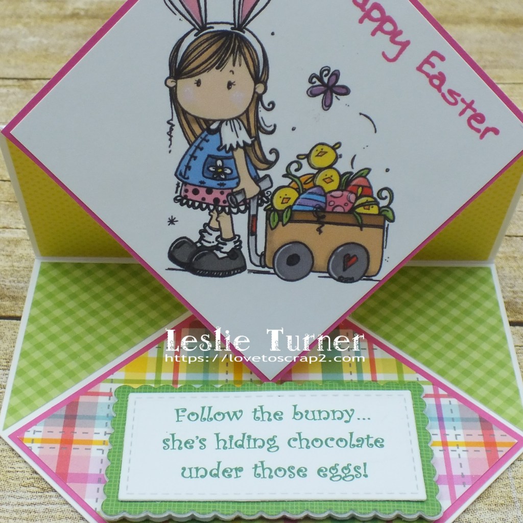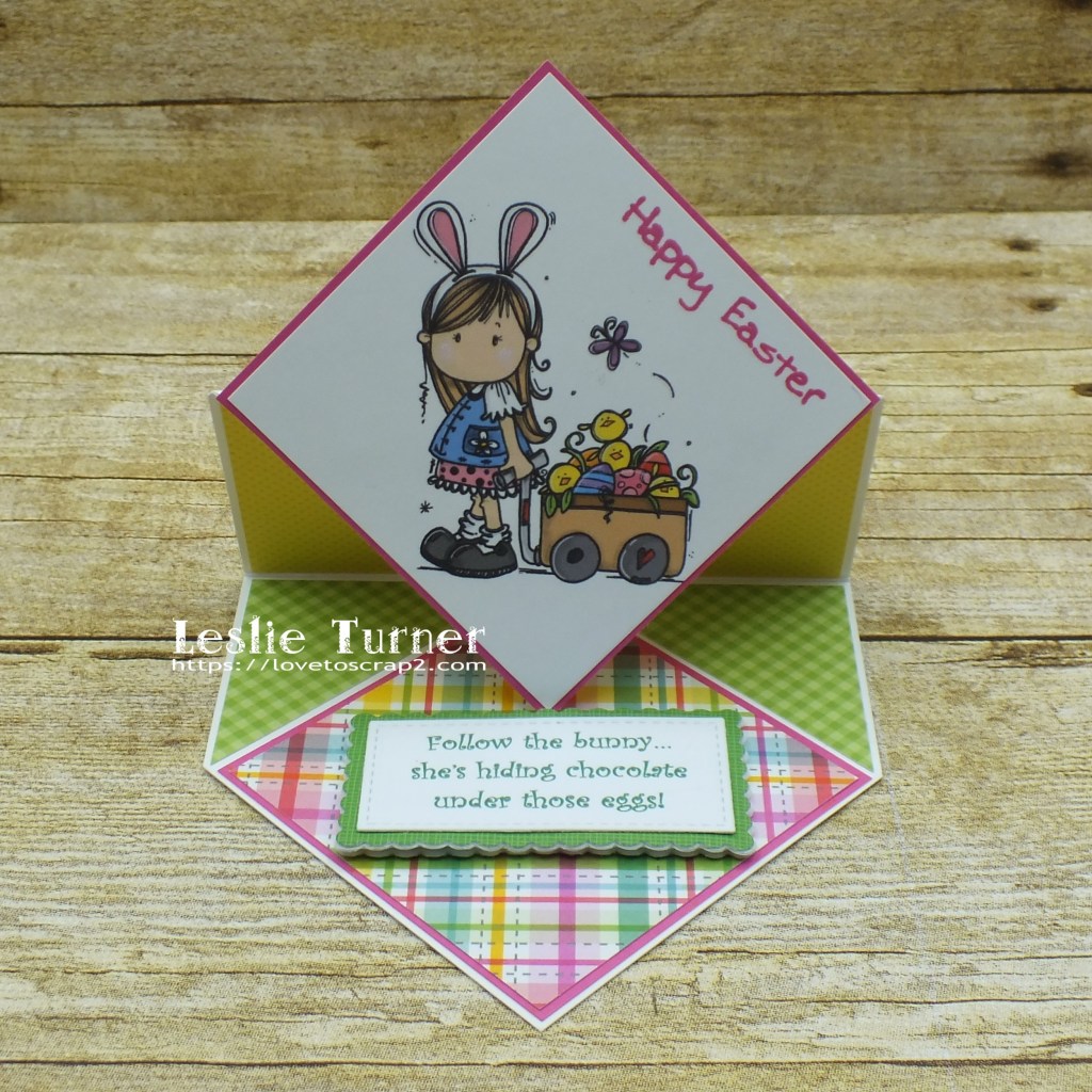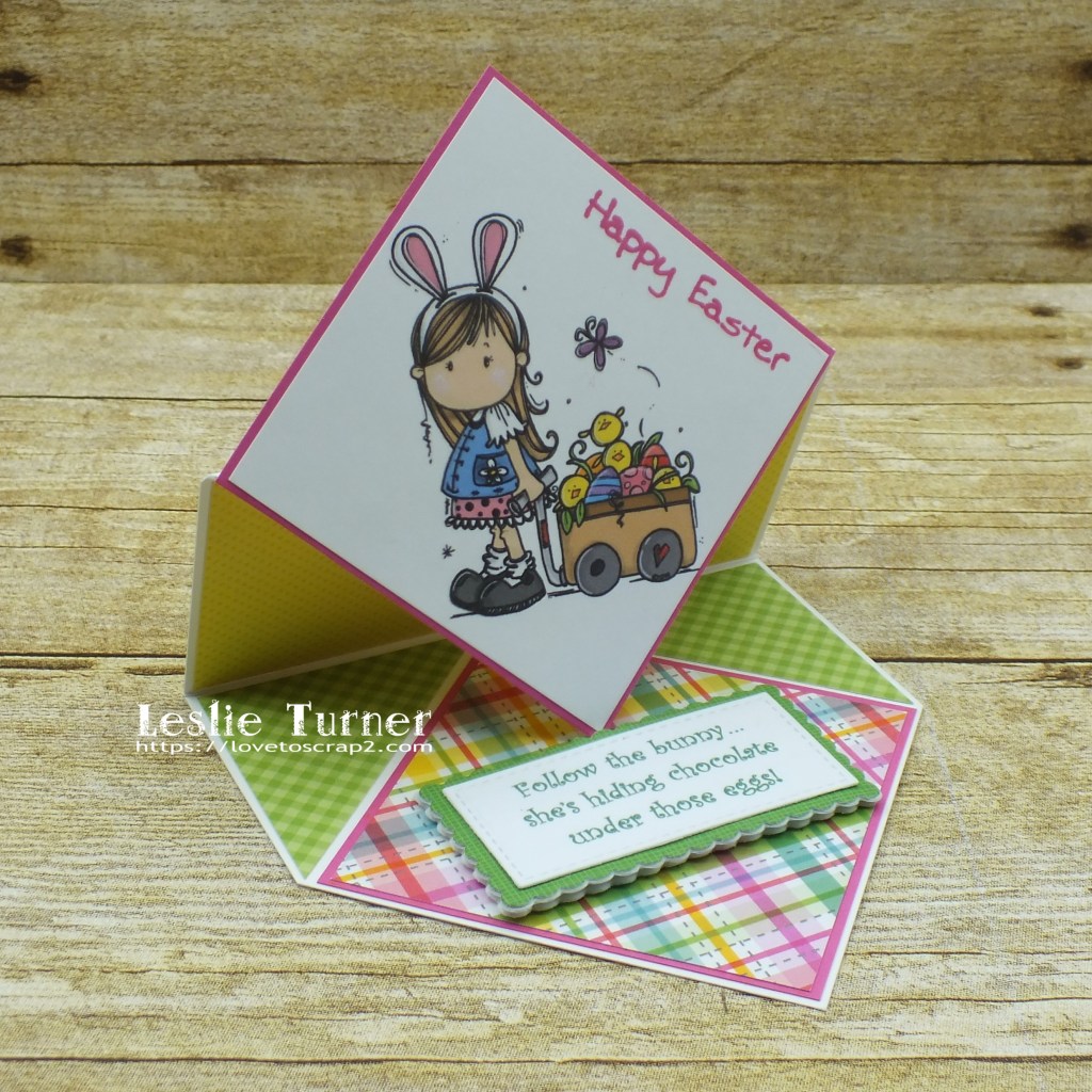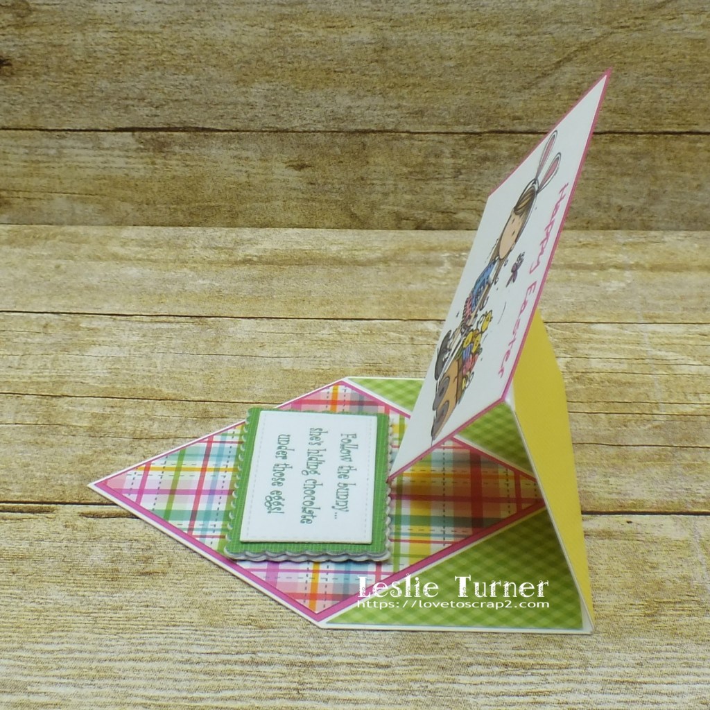 Happy Friday, friends! Well, another week is in the books… they sure are flying by! ZOOM! Affiliate links are used in this post at no cost to you – I really appreciate your support! I’ve popped in this morning with a fun fold that I found on Pinterest last week, so of course I had to make one! I finished it last week (before Easter) but haven’t had a chance to post it until this morning. It’s a diamond easel card that I created for The Outlawz April Freebie/Progressive Challenge! Our sponsor this month is Bugaboo Stamps so be sure to come on over and play for your chance to win a prize! We were gifted the adorable Bugaboo Brats Easter digital image which made the sweetest card, and I had the best time picking out coordinating patterned papers for it!