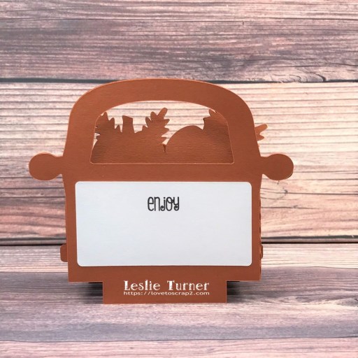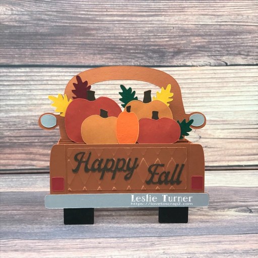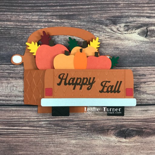 I cut the truck body and panels from CutCardStock Basis Dark Orange, the tires from Basis Black, the back lights from Basis Red, the sentiment from Basis Brown, and the bumper and mirrors from Stardream Metallic Silver cardstock. I cut the pumpkins and leaves from Basis Green, Basis Dark Red, Basis Gold, Basis Orange, Pop-Tone Orange Fizz and Pop-Tone Tangy Orange. I added some texture by using the Sizzix Texture Fades Harlequin embossing folder on the side and back panels, and the Darice Chevron embossing folder on the tires.