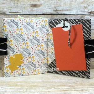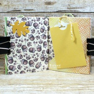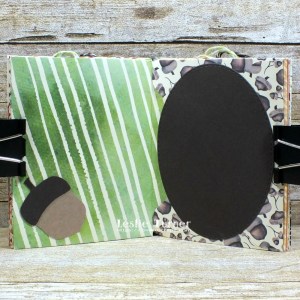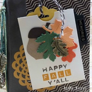 Besides the envelopes, I created notched pockets to use on the front and on various pages throughout the album, along with stitched oval and rectangle die cuts, punched acorns and die cut leaves to embellish the front and inside pages. The notched pockets hold little tags to use for journaling or photos. I tied small lengths of Baker’s Twine to the top of the tags.