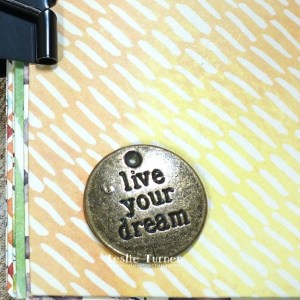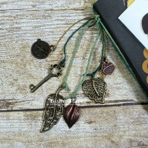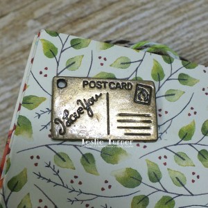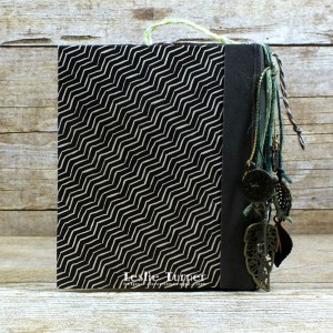I affixed charms to a couple of the pages, and adhered bamboo cord, twine and gold cord in the spine, and added charms for a little interest.