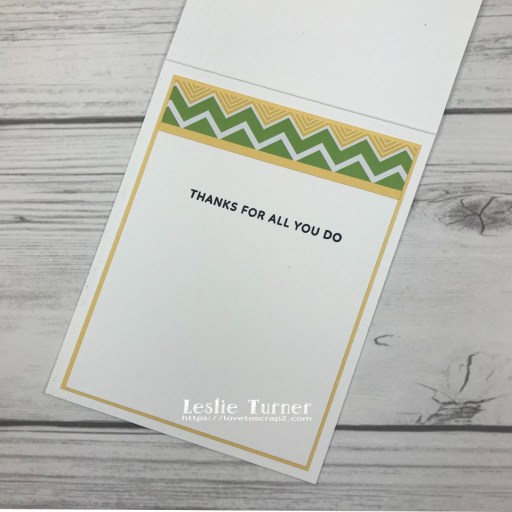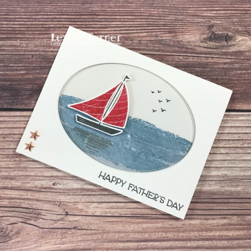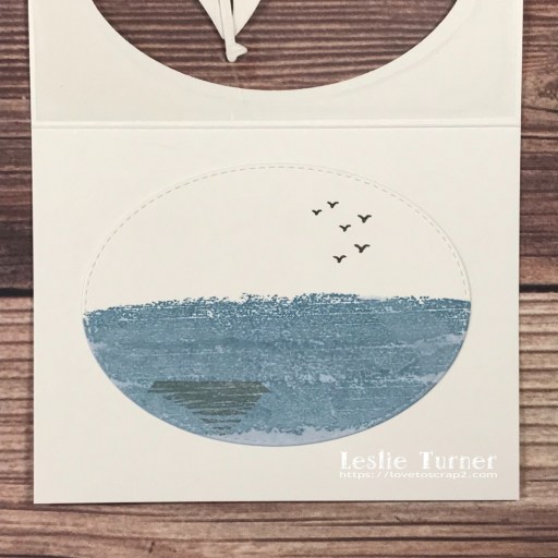 I reserved the stitched oval die cut from the front flap to use on the inside of the card. Using the Stampin’ Up Let’s Set Sail stamp set, I stamped the water in Catherine Pooler Stone Blue and Tranquil inks, sailboat shadow in Twilight ink, and birds in Jack Black ink, which completed the card.
