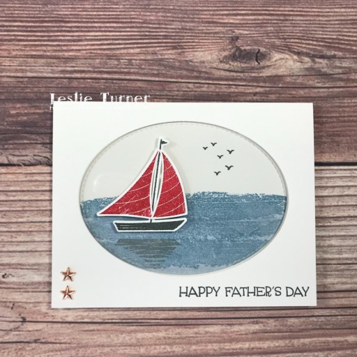 I cut a standard A2 size landscape top-folding card base from CutCardStock Basis 110# White cardstock. I cut an oval aperture in the front flap with a Memory Box Stitched Oval Layers die and adhered a piece of acetate behind it. Using Catherine Pooler Rockin’ Red and Black Jack inks along with the Stampin’ Up Let’s Set Sail stamp set and Sailboat Builder Punch, I created the sailboat and adhered it to the acetate on the front flap. Using the Hero Arts Year Round Messages stamp set, I stamped the sentiment in black ink in the lower right corner. The final touch was adding two Stampin’ Up Star Designer Elements to the lower left corner.