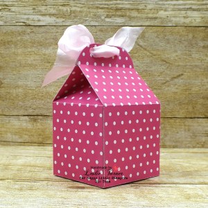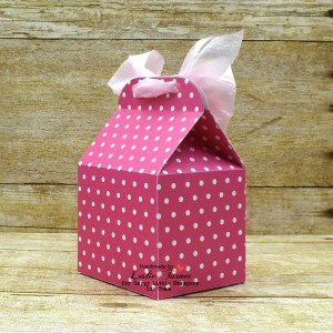 I created a super cute pink and white polkadot treat box using the Stampin’ Up Baker’s Box Thinlits. I cut three ‘yum’ sentiments from hot pink textured cardstock and adhered them on top of one another for a little dimension, and then added tiny dots with a white Gelly Roll pen. I used pink Silky Crush ribbon to tie the box closed.