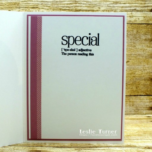 I cut the inside panel from Neenah Classic Crest 80# Solar White cardstock and embellished it with strips of the cardstock and patterned paper used on the front. I stamped the sentiment from the same stamp set in black ink, and layered the panel on the sugarplum cardstock.