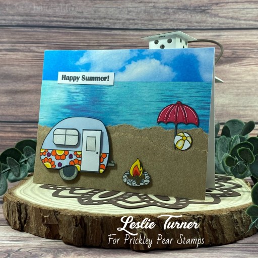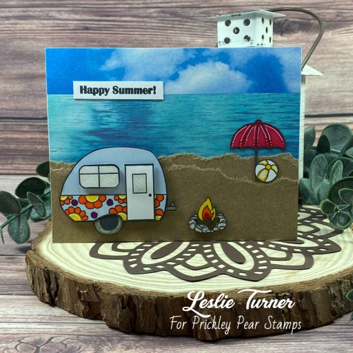 Hey everybody! Happy Tuesday! I’ve popped in with another Pajama Crafter Stamps project to share created with the awesome Prickley Pear Stamps Ham Camper Summer stamps. This is another one of the (many) projects I created prior to leaving the team at the end of February and hadn’t yet showcased. I’ve mentioned before that this stamp set is one of my favorites because Ed and I were full-time RVers for several years and we sure have some wonderful memories of places we visited and people we met! There are coordinating dies which you’ve seen me use but I chose to fussy cut the elements on this particular card with sky and water washi tape and torn kraft paper for sand! This is such a fun set for scene-building, and there are other Ham Camper sets so be sure to check them all out!
