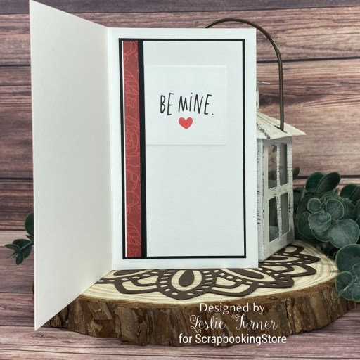 I cut a 3-1/2″ x 6″ mini slimline card base from CutCardStock Basis 110# White cardstock along with a layering panel for the focal image from CutCardStock Basis Black cardstock. Using the Kat Scrappiness Mini Slimline Quilted Backdrop Die, I die cut the front panel from a pretty red floral paper in the kit. I layered one of the larger journaling cards from the kit on the black panel and adhered the piece at an angle to the card front. The finishing touch was adding two Hobby Lobby red epoxy hearts.