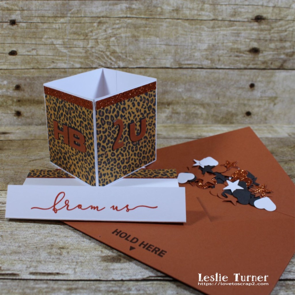 I created the box base from Neenah Classic Crest 80# Solar White cardstock and adhered panels cut from animal print cardstock as well as thin strips of orange Glitterstock. Using Waffle Flower Wide Alpha Dies and Waffle Flower Bold Alpha Dies, I cut the sentiment from CutCardStock Basis 80# Dark Orange cardstock and Papertrey Ink Dark Chocolate cardstock and layered them for a shadow effect. I created the card tray from Neenah Classic Crest 80# Solar White cardstock as well, and adhered strips of the animal print cardstock and a very thin strip of the orange Glitterstock across the top. I stamped ‘pull here’ (included with the punch board) at the top of the card tray, and the ‘from us’ sentiment from the Waffle Flower Sentiment Additions stamp set across the bottom in Catherine Pooler Mandarin Spice ink. The confetti consists of a variety of hearts and stars punched from the white, dark brown and orange Glitterstock. The punch board actually punches the hearts (WRMK thinks of everything, lol) and I used an itty bitty star punch from my stash.