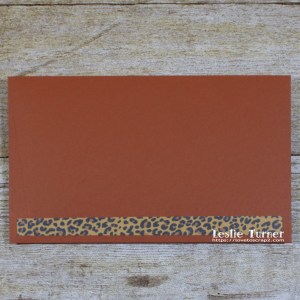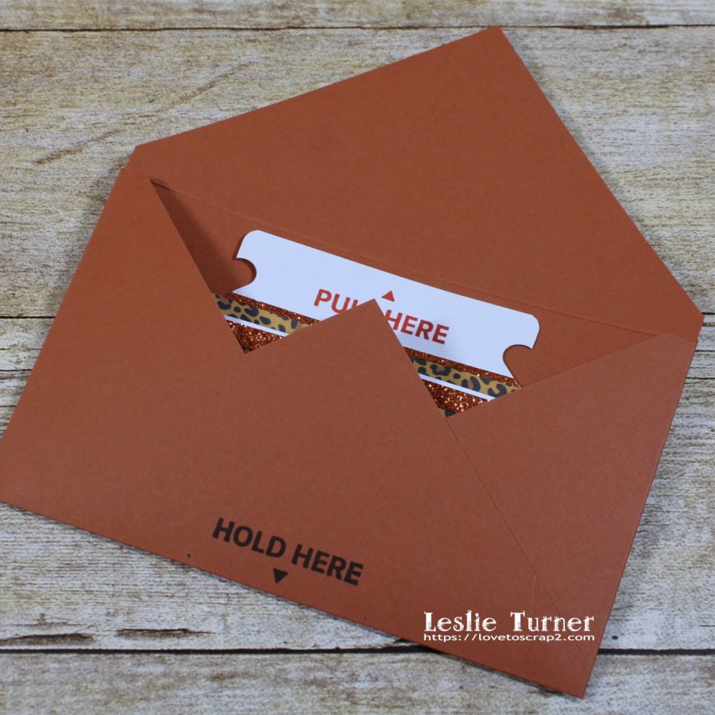 I created an envelope with the same punch board from CutCardStock Basis 80# Dark Orange cardstock, stamped ‘hold here’ at the bottom on the back side in Catherine Pooler Icing On The Cake ink, and added a strip of the animal print cardstock to the bottom front.