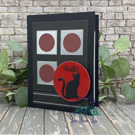 I cut the card base from CutCardStock Astrobrights Eclipse Black cardstock. Using our Background Builder One die set, I cut the pieces from our Neutrals paper pack, Linen Rainbow paper pack, and Silver Mirror cardstock, along with some rust colored cardstock from my stash. I used our Sitting Cat die for the focal image along with an embossed sentiment from our Just Because stamp set. The finishing touch was adding a couple strips of our Silver Sway peel-offs.
