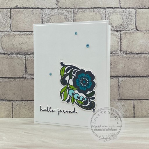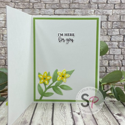 I cut the inside panel from Neenah Classic Crest 80# Solar White and embellished it with the leaf sprig and a couple leftover flowers. I added another sentiment stamped from the Here For You Clear Stamps & Dies which was also stamped in Versafine Onyx Black ink and cut with the coordinating die. I added a Brutus Monroe Emerald Green Flat Back Crystal to the center of these two flowers as well. For more in-depth details, be sure to see my tutorial on the Scrapbook Pal blog.