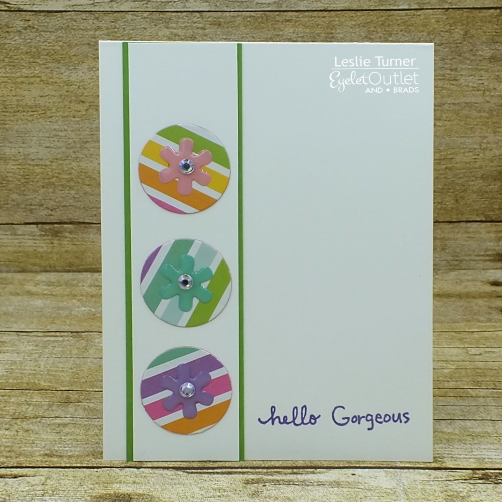 Hi everyone! Happy Saturday to you! They sure roll around fast, don’t they?! Affiliate links are used in this post at no cost to you. I really appreciate your support! I’m thrilled to be on the Eyelet Outlet Blog today with a fun DT inspiration project and something a little different than the last few projects I’ve posted! My last several cards were created with the new quarantined-inspired brads in the store and were a series of clean and simple cards paying tribute to our frontline healthcare workers. It’s almost the middle of March and I thought a pretty Spring-themed friendship card was in order so I used some fun epoxy flowers embellished with clear bling on the front and some lovely purple check washi tape on the inside!
