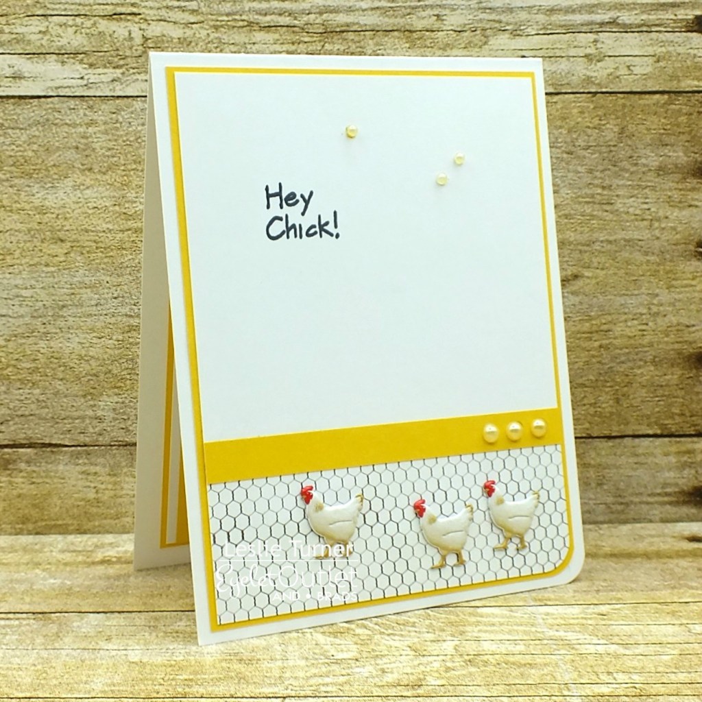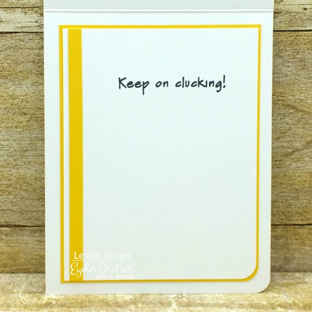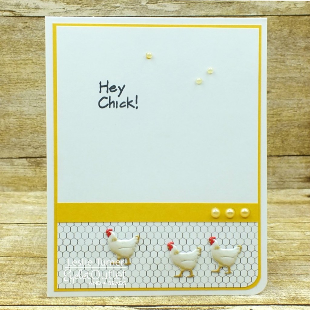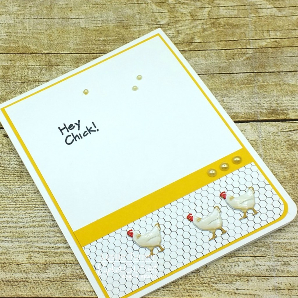 First of all, aren’t these Chicken Brads just a hoot?! When I saw them, I knew I had to have them because I have the perfect stamp set to use with them! I created a top folding card base from Neenah Classic Crest Solar White cardstock and rounded the bottom right corner. I dug into my digital image stash and found a small chicken wire image that I duplicated multiple times and pieced together to make it large enough to go across the panel, keeping it proportional to the size of the chicken brads. I complimented the white cardstock with yellow cardstock, and stamped the sentiment in black ink. I added the Chicken Brads, a few scattered pearls from a White Pearl Bling Strip on the background and three slightly larger White Pearl Bling on the yellow cardstock strip. I colored all the pearls with a tan-colored alcohol marker prior to affixing them to the card front.