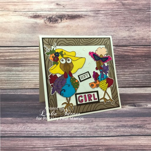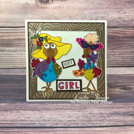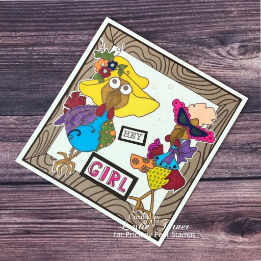 Hey everybody! I hope you’re having a fabulous weekend and you’re getting to do something fun! I’m sharing another friendship card for the Prickley Pear Stamps new release that I created with the Hey Girl Hey stamp set, the Chicken Wire Background stamp and the Slimline Woodgrain Background stamp! I thought these brightly-colored girls would look good on a chicken wire background stamped in gold ink – and they just had to have a frame around them! So stinkin’ cute! ;)