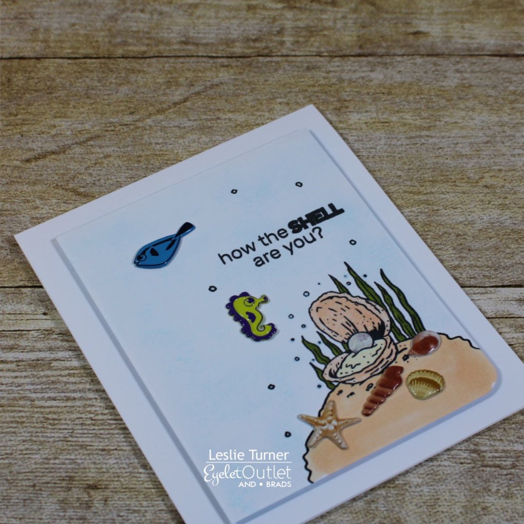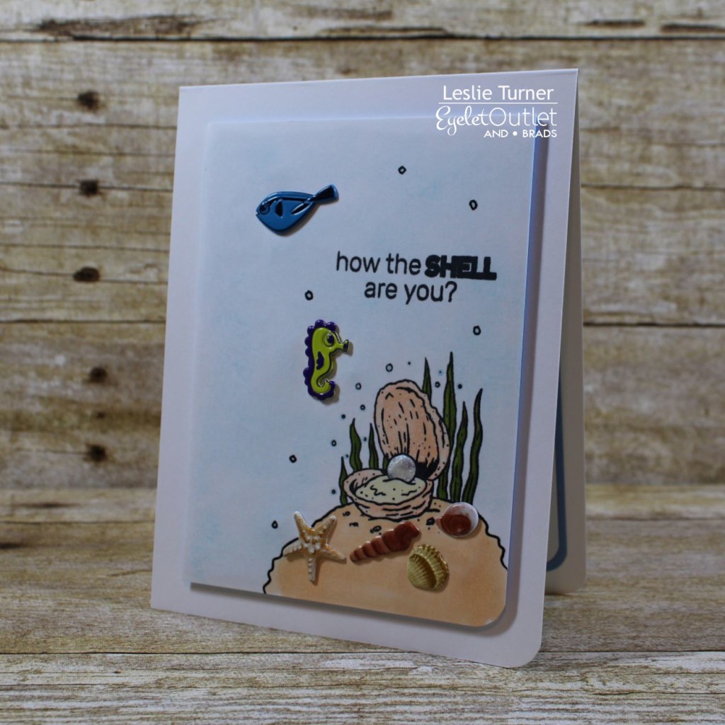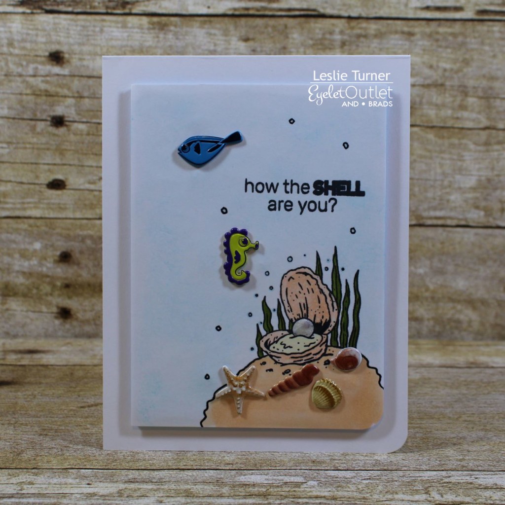 Howdy, friends! A very Happy Saturday to you – I hope you’ve had a great week! Affiliate links are used in this post at no cost to you. I really appreciate your support! I’m delighted to be back on the Eyelet Outlet blog today with another awesome DT inspiration project! I created a super fun ‘just because’ note card featuring Shell Brads, Sea Shore Brads and Fish Brads which were just the ticket to pair with this adorable Brutus Monroe stamp set!