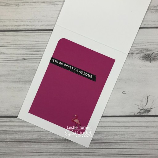 The inside of this card is slightly different – with a pink panel rather than white – which I thought created some interest. So I cut the inside panel from CutCardStock Basis Magenta cardstock, rounded the top left and bottom right corners, and added a Flamingo Brad and another sentiment from the Taylored Expressions Simple Strips in Reverse – Everyday Occasions.