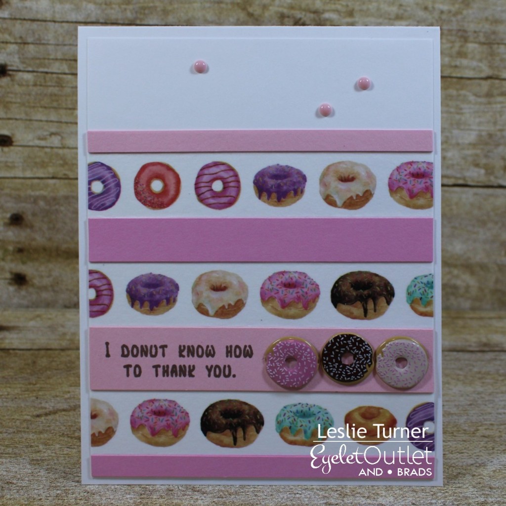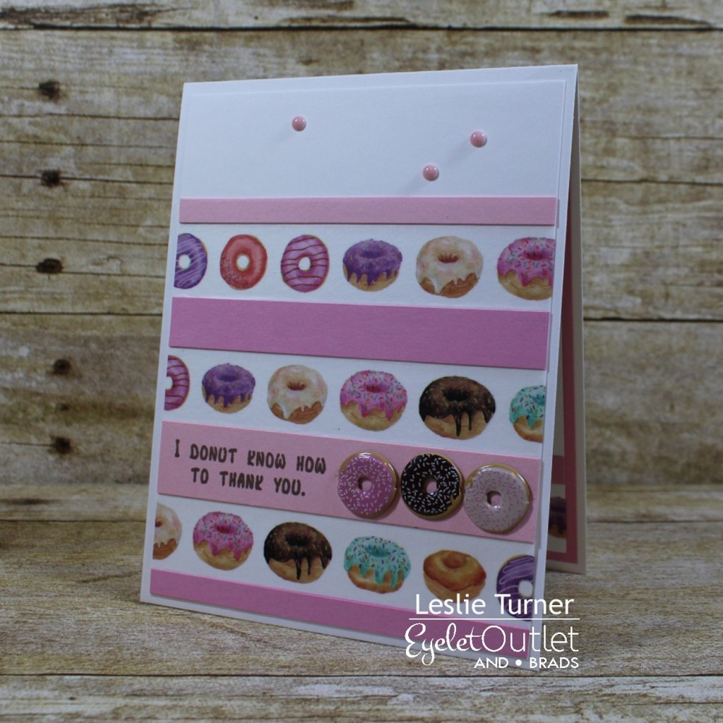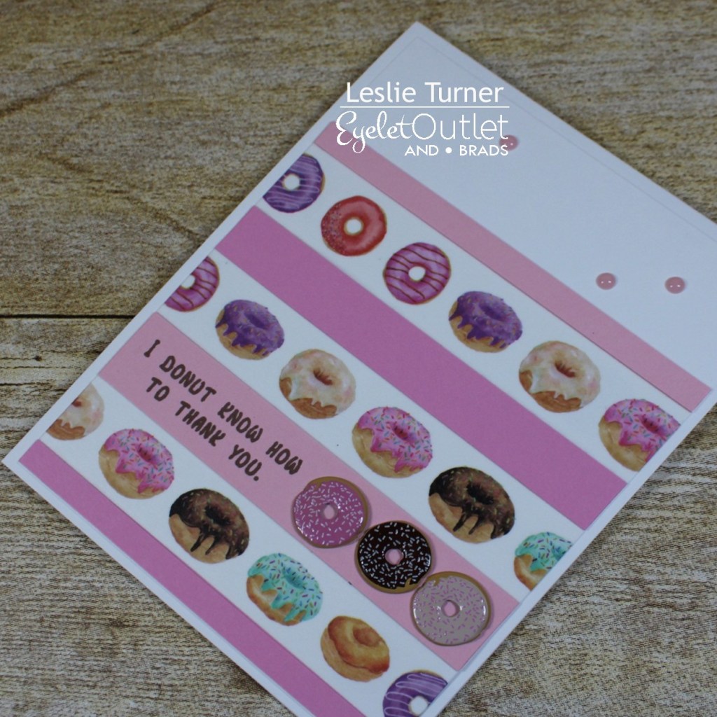 Hi everyone! A very Happy Saturday to you – I hope you’ve had a great week! If you live in the States, you know that today is a sad date to remember – this day marks the 20th anniversary of the multiple terrorist attacks on the World Trade Center. After all these years, my heart still breaks for the families and friends of all those who lost their lives that day. Please take a moment to remember them. Now on to something happy! Affiliate links are used in this post at no cost to you. I really appreciate your support! I’m stoked to be back on the Eyelet Outlet blog today with another awesome DT inspiration project! I created a super fun thank you card featuring our Donut Brads, Donut Washi Tape and Light Pink Enamel Dots! I LOVE these brads and coordinating washi tape! OMG, these make such fun cards!