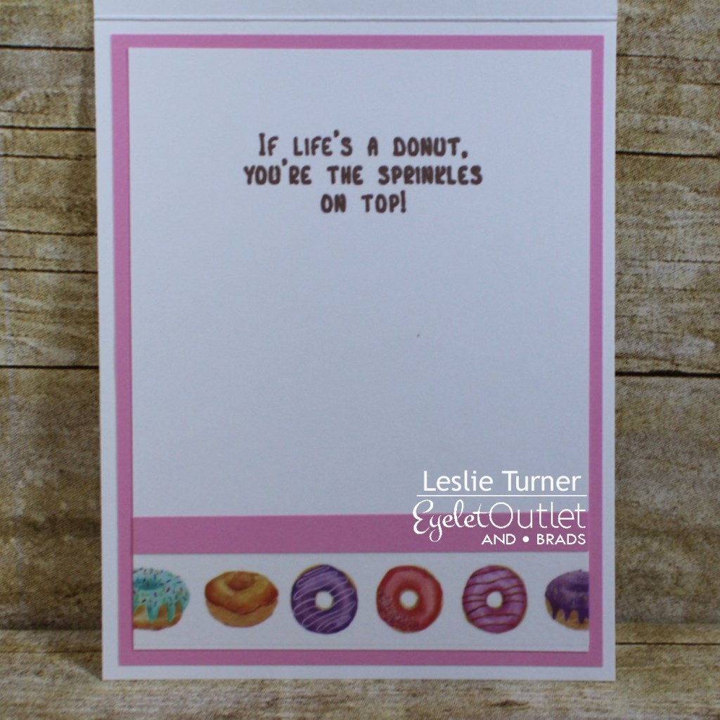I cut a standard A2 size top-folding card base from Neenah Classic Crest Solar White 110# cardstock along with a slightly smaller layering panel from Neenah Classic Crest Solar White 80# cardstock which I embellished with layered strips of CutCardStock Pop-Tone Cotton Candy cardstock alternating with CutCardStock Basis Pink cardstock and Donut Washi Tape between each strip. I stamped the sentiment on the next to the last strip in brown ink, added three Donut Brads, and then adhered the panel to the card base. I added some Light Pink Enamel Dots to complete the card front.