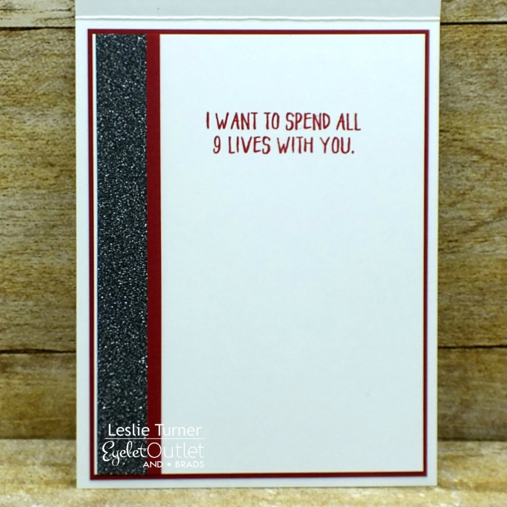 I created a narrow front panel which I covered in vertical strips of Glitter Black Washi Tape. I positioned two Cat Brads in the lower right corner and adhered the panel to the card base. I punched two small hearts from red cardstock and adhered them above the cats. I stamped the sentiment in red ink on white cardstock, trimmed it and adhered it across the top of the panel.