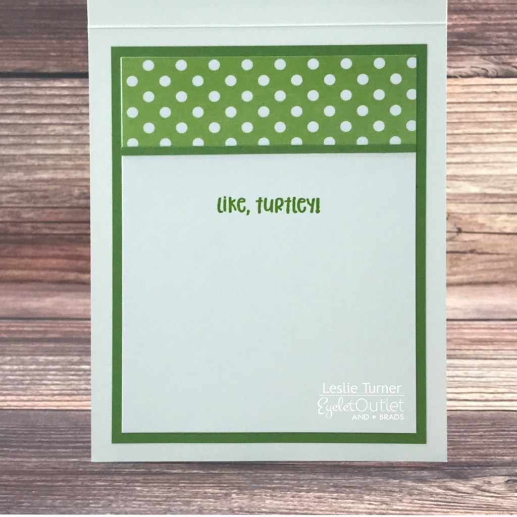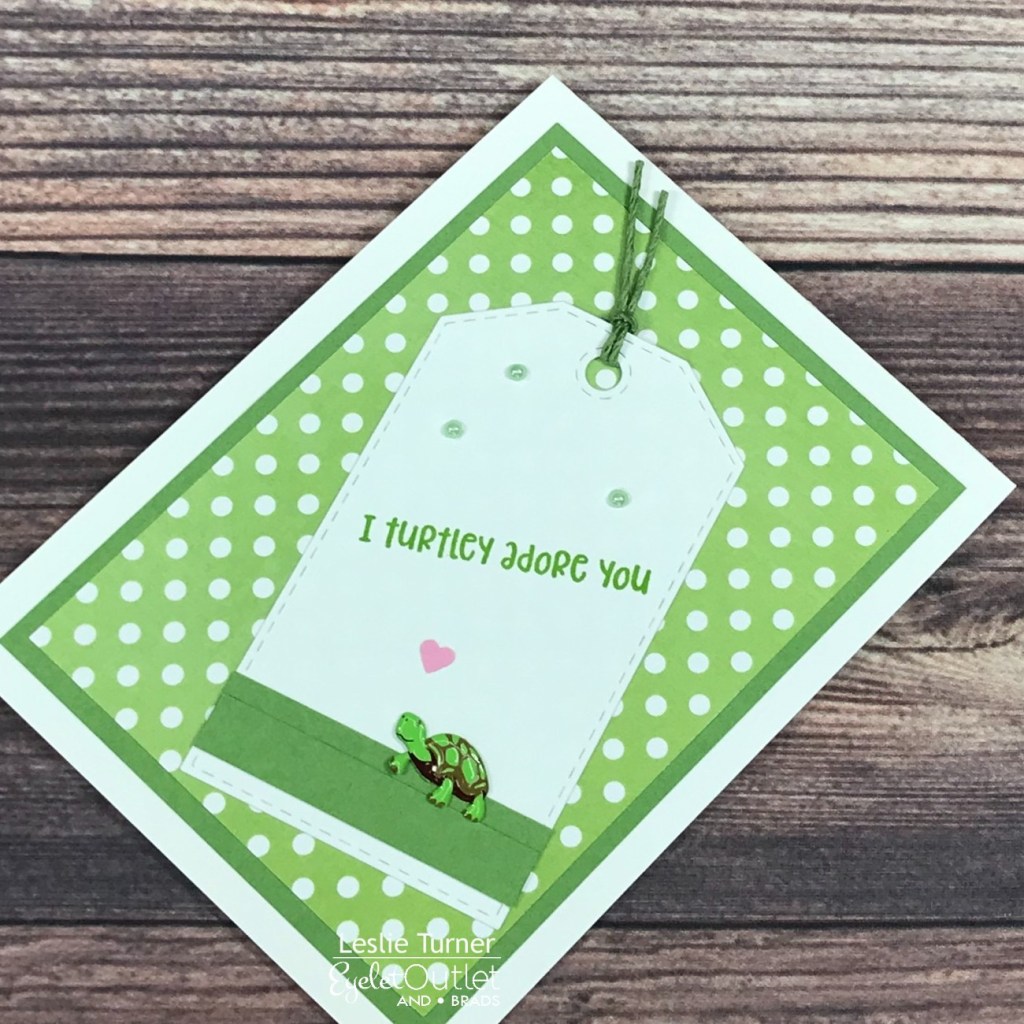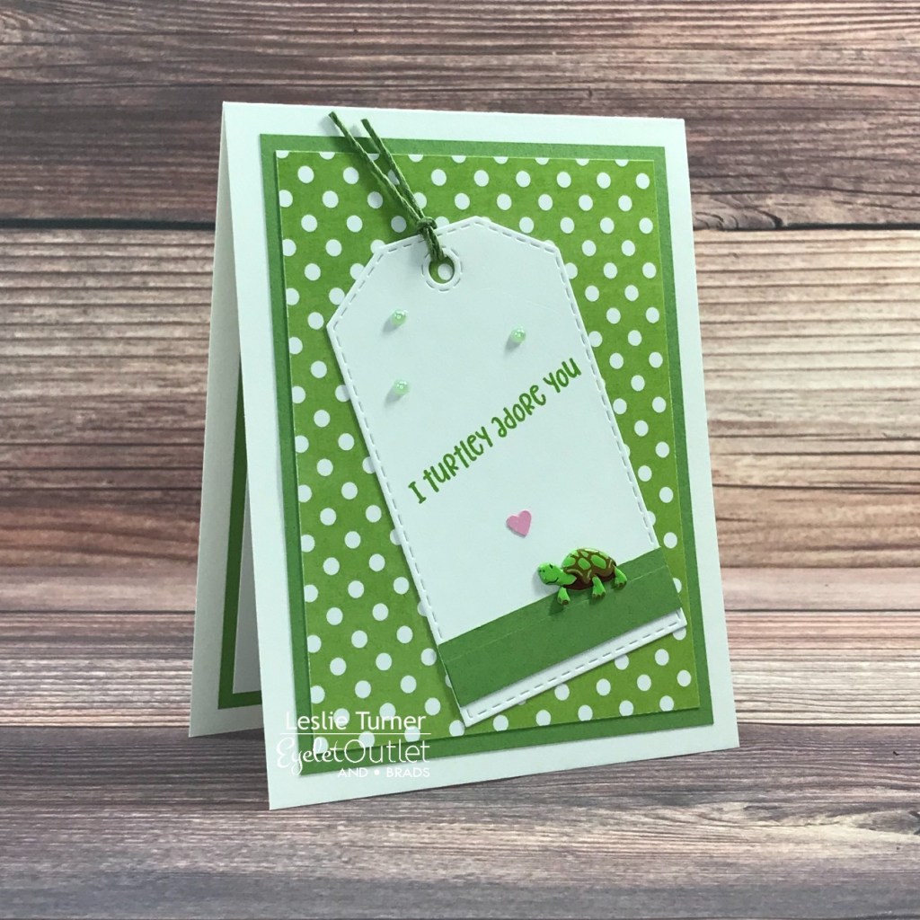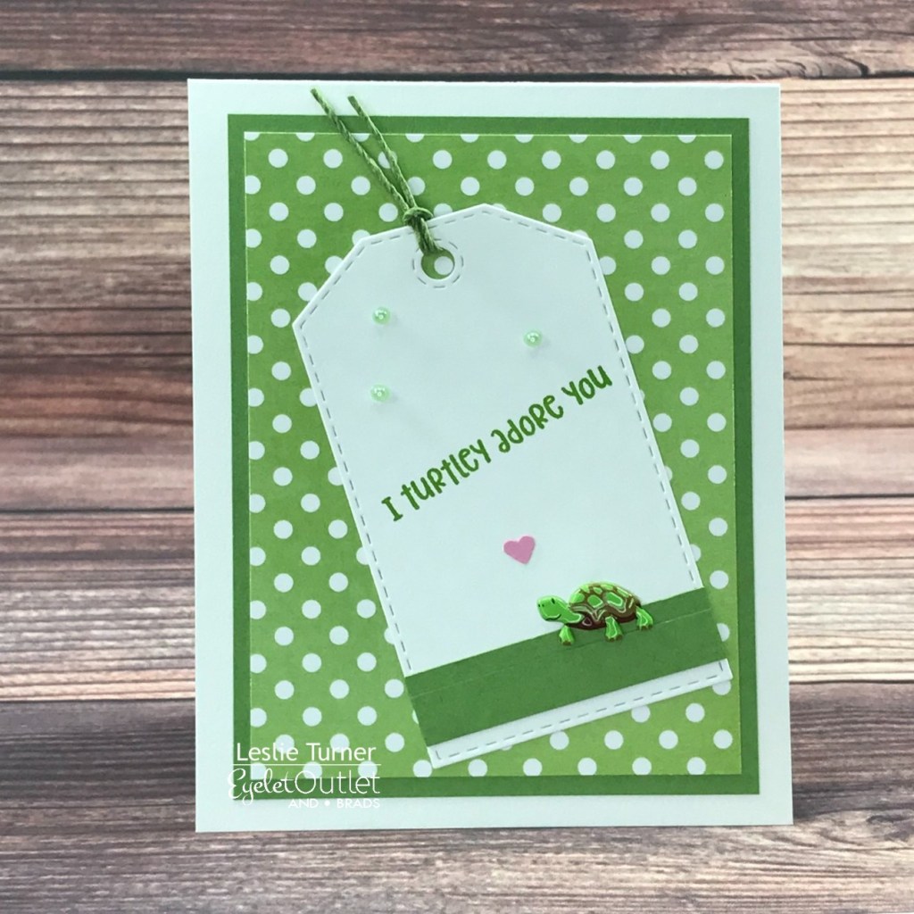 Hi everyone! A very Happy Saturday to you – I hope you’ve had a great week! Affiliate links are used in this post at no cost to you – I really appreciate your support! I’m stoked to be back on the Eyelet Outlet blog today with another awesome DT inspiration project! I created a super sweet CAS-ish card featuring our Turtle Brads and Pearl Bling Multi Size Green! There’s something about a tag on the front of card… and especially a tag with a super cute turtle and a pun-y sentiment! This is so stinkin’ cute I can’t stand it! And sometimes less is definitely more!