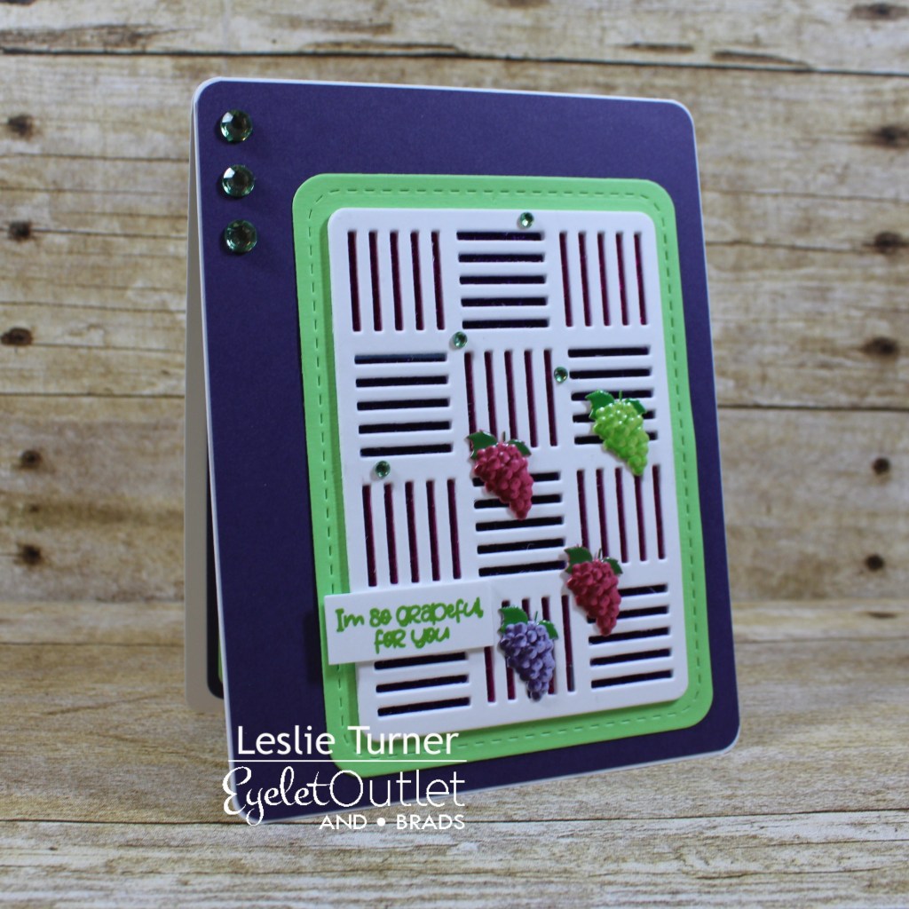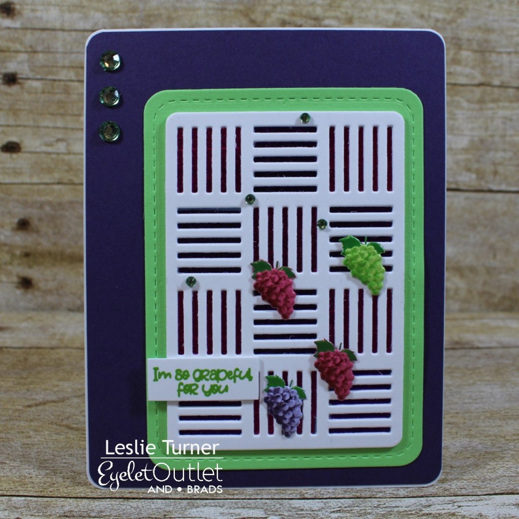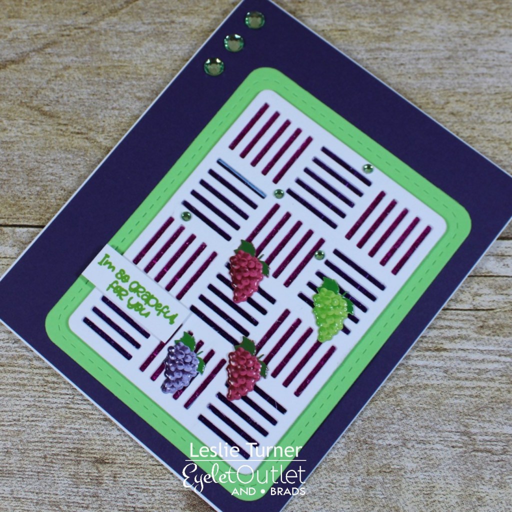 Hi everyone! A very Happy Saturday to you – I hope you’ve had an awesome week! I can’t believe we’re on the downhill slope toward the end of September and we’ll soon be welcoming October! Affiliate links are used in this post at no cost to you. I really appreciate your support! I’m stoked to be back on the Eyelet Outlet blog today with another awesome DT inspiration project! I created a super fun friendship/thank you card featuring our Grape Brads, Purple Foil Washi Tape, Pink Foil Washi Tape and Green Jewel Bling! I’ve had this die in my stash for a minute and thought it would be fun to place the purple and pink foil washi tape beneath the dashed apertures to use as the background for the hanging clusters of grapes and fun sentiment! I’m such a sucker for pun-y sentiments, lol!