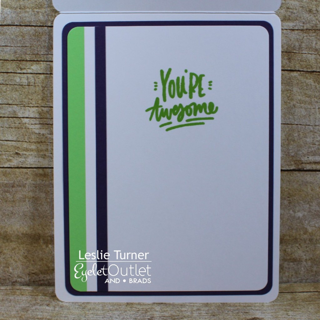I cut the inside panel from Neenah Classic Crest 80# Solar White cardstock and embellished it with strips of CutCardStock Basis Light Lime cardstock, Neenah Classic Crest 80# Solar White cardstock and CutCardStock Basis Dark Purple cardstock. I stamped the sentiment in green ink and layered the panel on the purple cardstock.