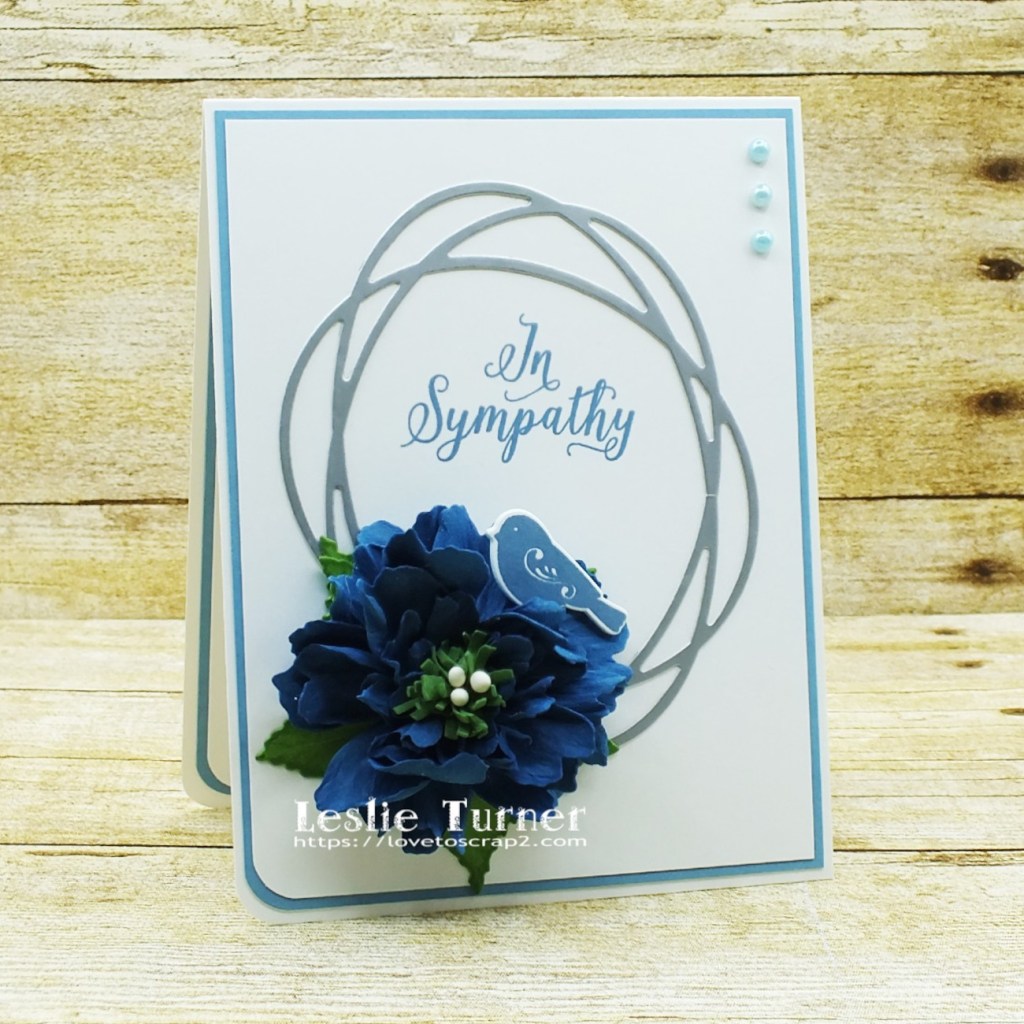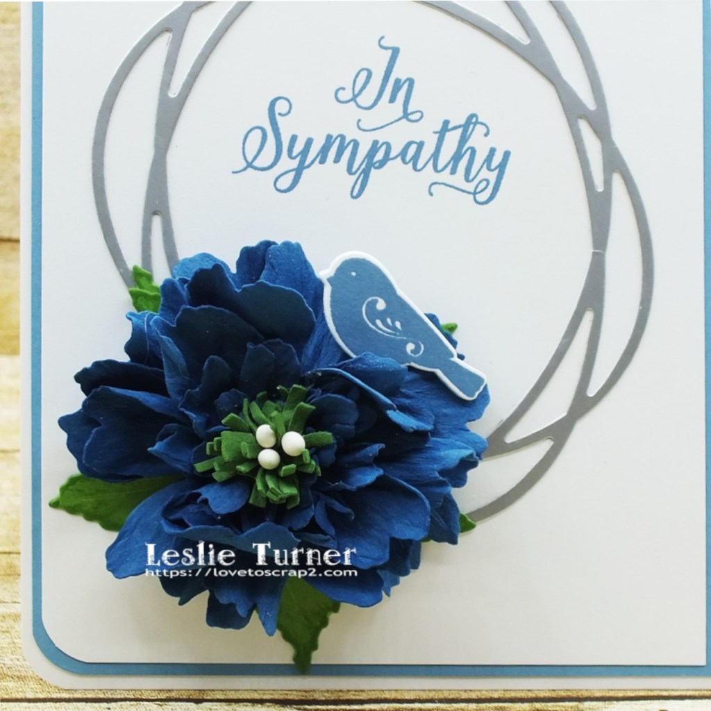 I cut my typical A2 size top-folding card base from Neenah Classic Crest 110# Solar White cardstock and rounded the bottom left corner this time. I cut layering panels from Neenah Classic Crest Solar White 80# cardstock and blue cardstock, adhered them together and then to the card base. I cut a connected oval die cut from metallic silver cardstock and adhered it to the front panel. I stamped the sympathy sentiment in blue ink in the center of the die cut. I adhered the foamiran flower and several leaves die cut from Papertrey Ink New Leaf cardstock (and inked with Ranger mowed lawn distress ink) to a 3/4″ punched circle. I found that adhering these large flowers with leaves to a punched circle makes it cleaner and easier to adhere to the card front.
