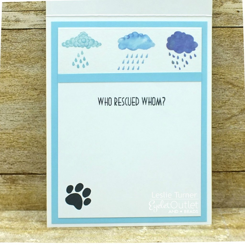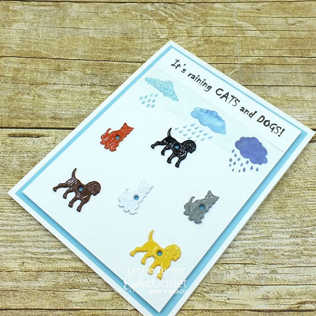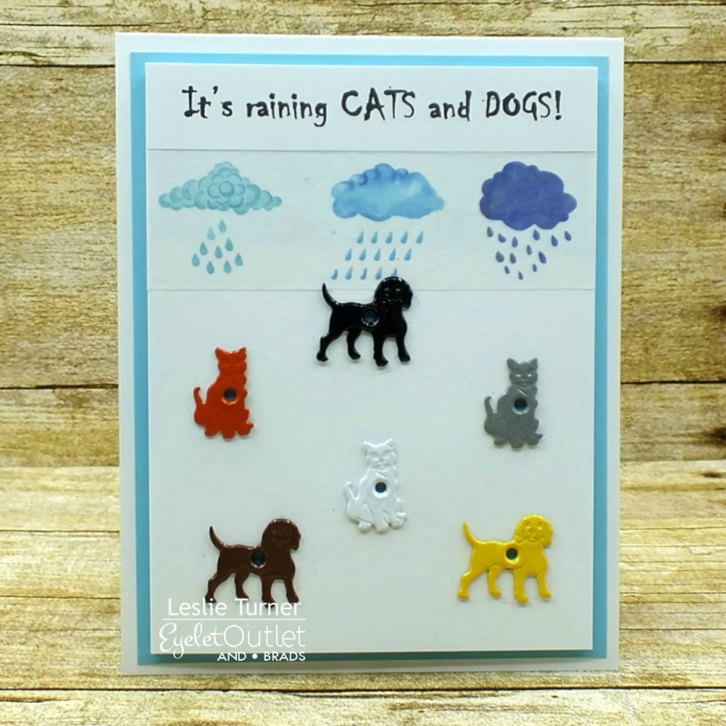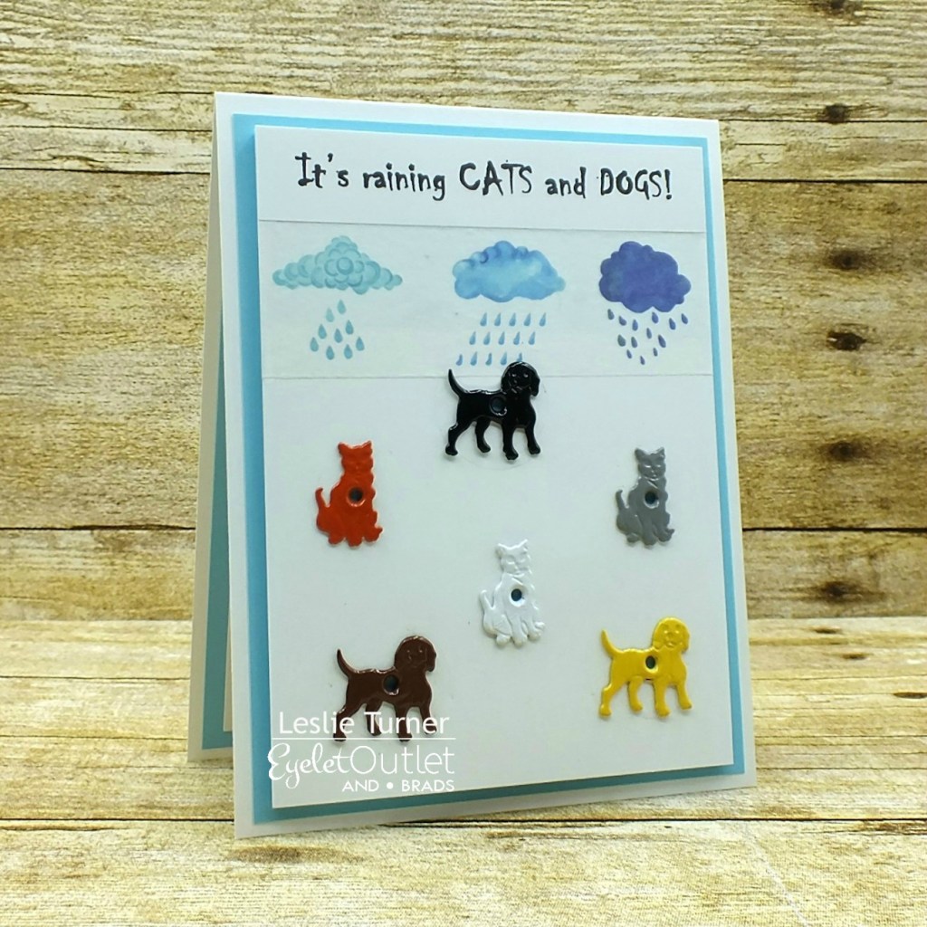 I created a top fold card base and a slightly smaller background panel from Neenah Classic Crest Solar White cardstock. I created a computer-generated sentiment which I printed on Neenah Classic Crest Solar White cardstock and adhered across the top of the panel, then put a strip of Weather Washi Tape just beneath it. Then the fun began adding Cat Quicklet Eyelets and Dog Quicklet Eyelets in a ‘raining-down’ fashion. I’ve never used quicklets before and these were so easy to set with a ballpoint pen! I adhered a piece of light blue cardstock to the card base, then adhered a piece of light blue craft foam to the back of the panel, and adhered the panel to the card base.