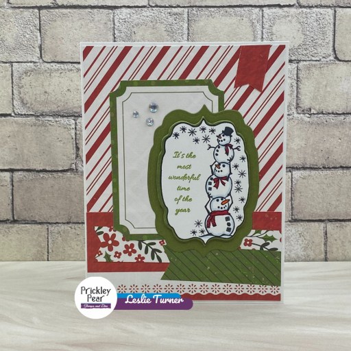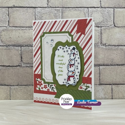 The card base was cut from Neenah Classic Crest 80# Solar White cardstock and layered with a panel cut from the Echo Park ‘A Perfect Christmas’ Collection Kit which already had faux lace and off-kilter horizontal flags across the bottom that I thought looked so cute with the stamped snowmen! I used the Flourished Oval 3 – Holidays stamp set along with the Flourished Oval Die and Flourished Oval Nesting Dies to create the focal image. I also used a journaling card from the collection to layer the focal image. The finishing touches were an off-kilter vertical flag cut from a leftover strip and some iridescent gemstones.