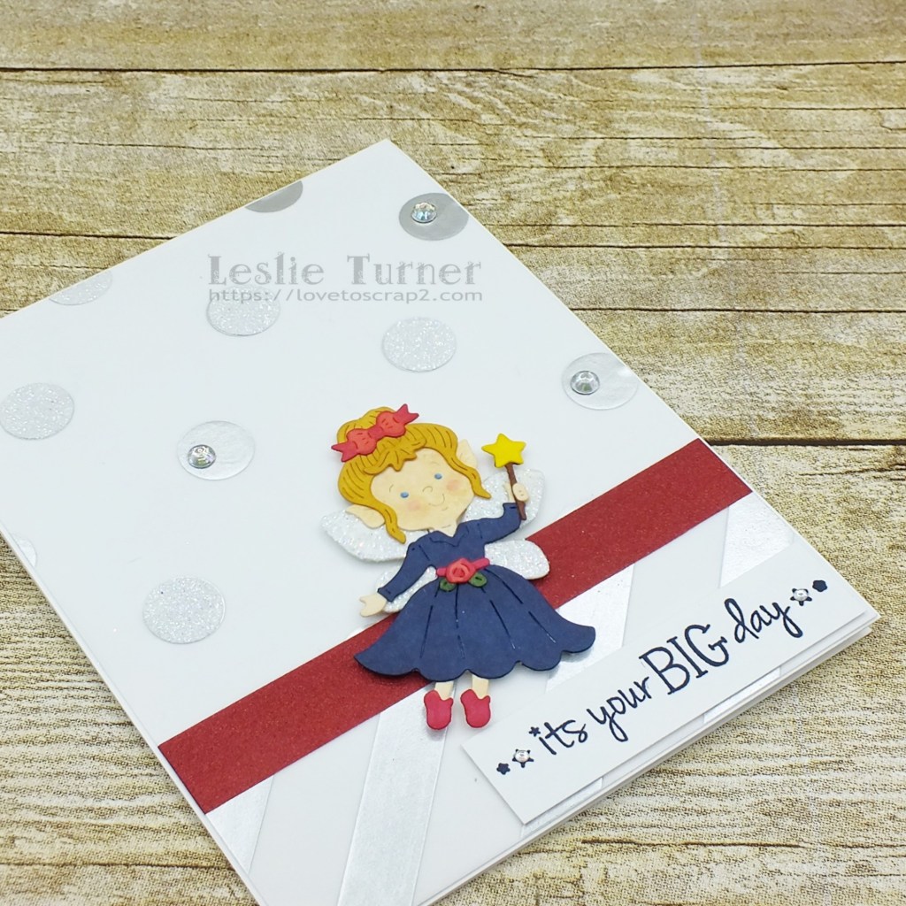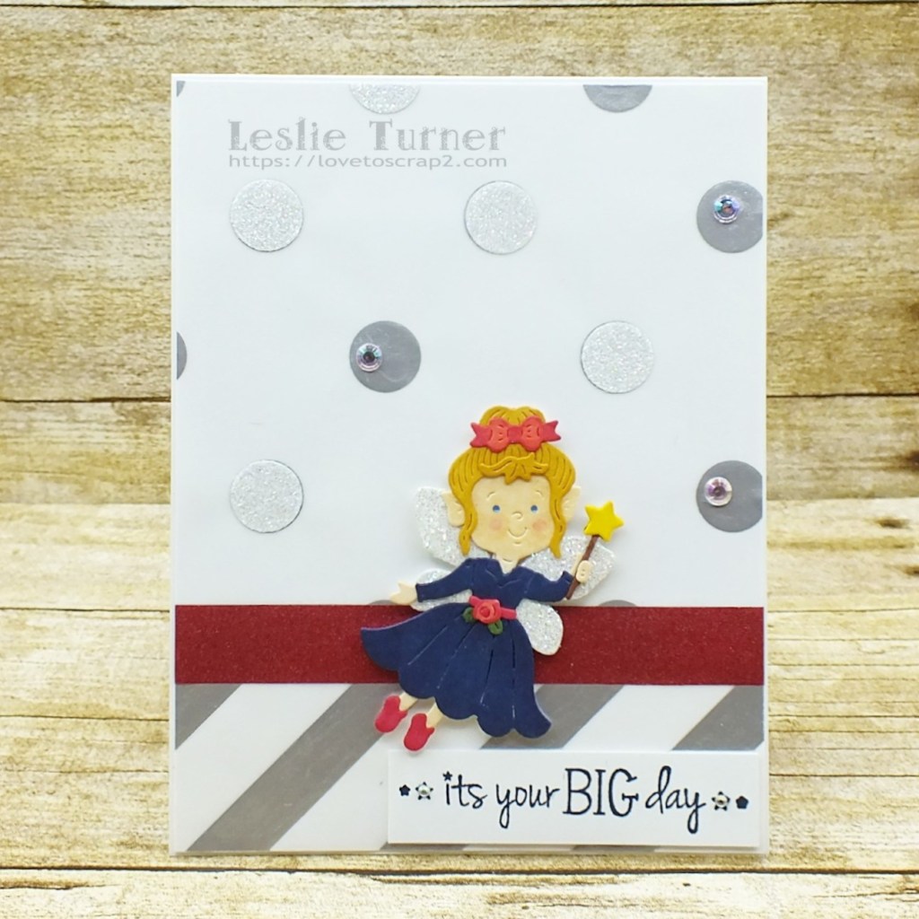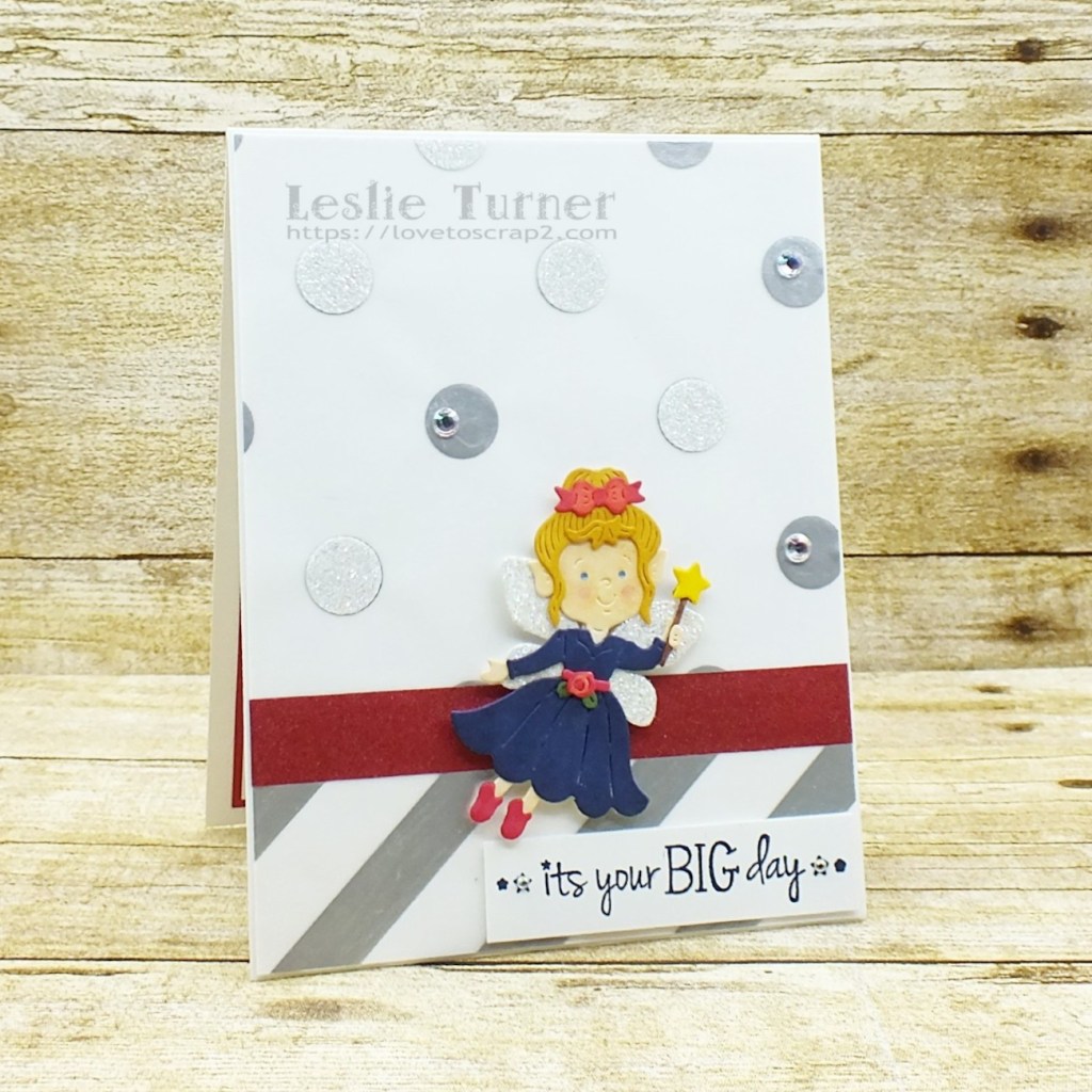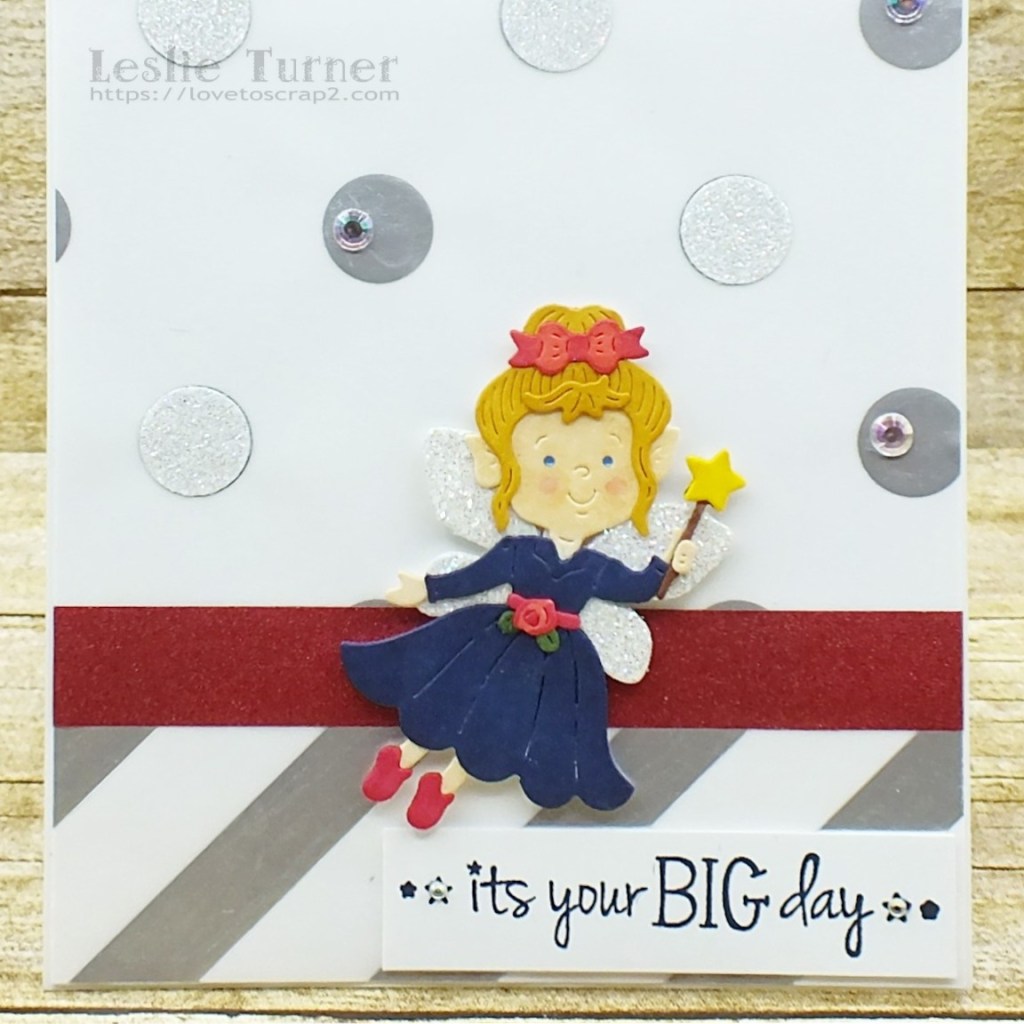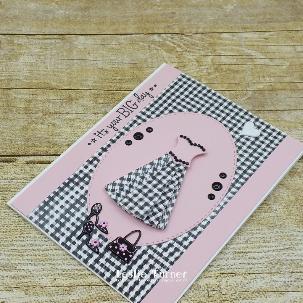 I created a standard A2 size top-folding card base from Neenah Classic Crest Solar White cardstock, along with a black and white gingham paper layer for the front and narrow strips cut from CutCardStock Basis Pink cardstock for the sides. I adhered a stitched oval die cut to the center of the panel cut from CutCardStock Basis Pink cardstock and stamped the sentiment vertically on the left side in black ink. I created the dress from the same black and white gingham paper and CutCardStock Basis Pink cardstock, added tiny black gemstones to the bodice, and adhered it to the center of the oval die cut I added the shoes and purse brads, a white heart brad, and several black gemstones on the sides of the oval, and adhered the panel to the card base.