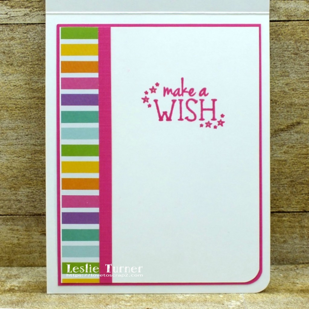 I embellished the inside panel with a leftover strip of the striped paper and the pink cardstock used on the front, and stamped the sentiment in Ranger picked raspberry archival ink. I colored the tiny stars in the sentiment with Sakura Clear Star Gelly Roll pen.