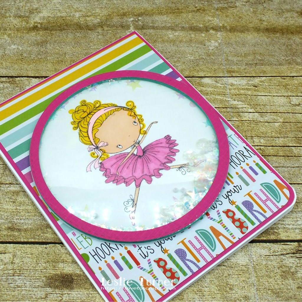 I created the card base from Neenah Classic Crest Solar White cardstock and rounded the lower right corner. I used bright and cheerful birthday papers from one of my favorite paper pads. I colored the image with alcohol markers and cut it with a circle die. I also cut the craft plastic with the same die and then cut a frame with that die and one slightly smaller. Using those two dies, I cut another ‘frame’ from teal craft foam to adhere beneath the pink cardstock frame. I love the colored foam to peek out from the edge of a frame or image! The shaker filler is a mixture of Pretty Pink Posh Marshmallow Seed Beads and Confetti.