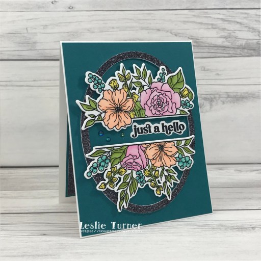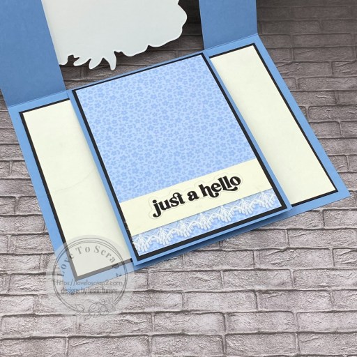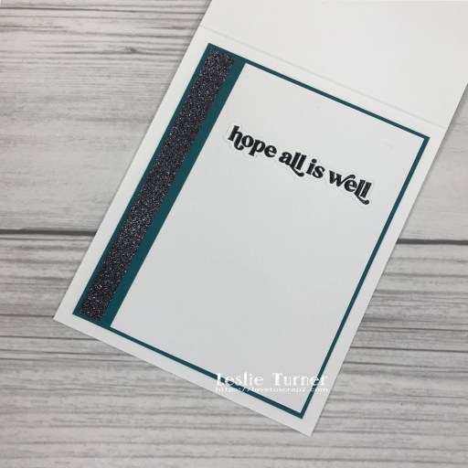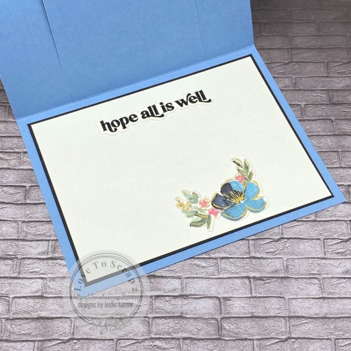 The inside of this card is fun… the narrow outside panels lift to reveal just the center panel. Then the center panel lifts to reveal the inside of the card which features an additional stamped and heat embossed sentiment and another Anemone Magic bloom positioned so it’s hidden under the center panel.