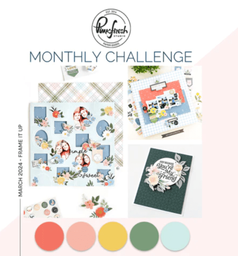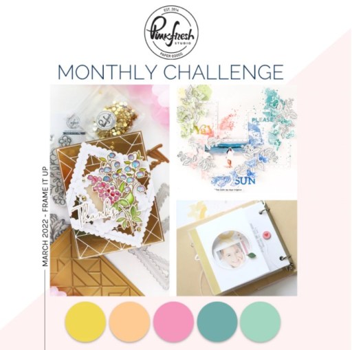 Hey everybody, Happy Monday! We’ve gotten several inches of snow here yesterday and the day before, and I can honestly say we’re ready for Mother Nature to get her act together and give us some real Spring weather! I’ve popped in this morning with a spanner panel card I made to enter into the Pinkfresh Studio March Challenge – Frame It Up! Challenge participants are invited to use a frame on their project or use any of the suggested colors of Pinkfresh Studio’s Mango Sorbet/Fruit Punch, Sunkissed, Sweet Mustard, Eucalyptus, and Ocean Breeze. I framed one of the florals on the focal image and used all but one of the colors.