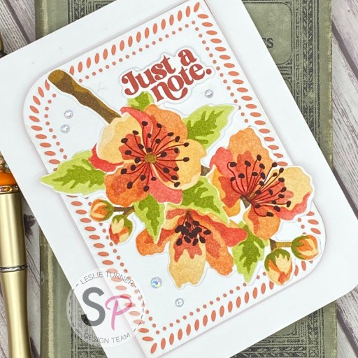 I started by creating the focal image on Savoy Cotton Brilliant White cardstock using the stencils in the Altenew Blooming Branch Bundle, my MISTI, a MISTI Sticky Sheet and a variety of Ranger distress inks. I stamped the details on the blooms and then cut the image using the add-on dies in the bundle. Using dies in the Pinkfresh Studio Rounded & Braided Rectangles dies, I cut the card base from Neenah Classic Linen 100# Solar White along with layering panels from 80# Solar White Linen and CutCardStock Peach cardstock.