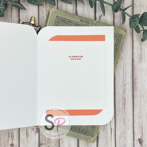 Using the same Pinkfresh Studio Rounded & Braided Rectangles die set, I cut an inside panel from 80# Solar White cardstock and embellished it with two strips cut from Peach cardstock scraps. I stamped another sentiment from the bundle on the Mini MISTI which completed the card.
