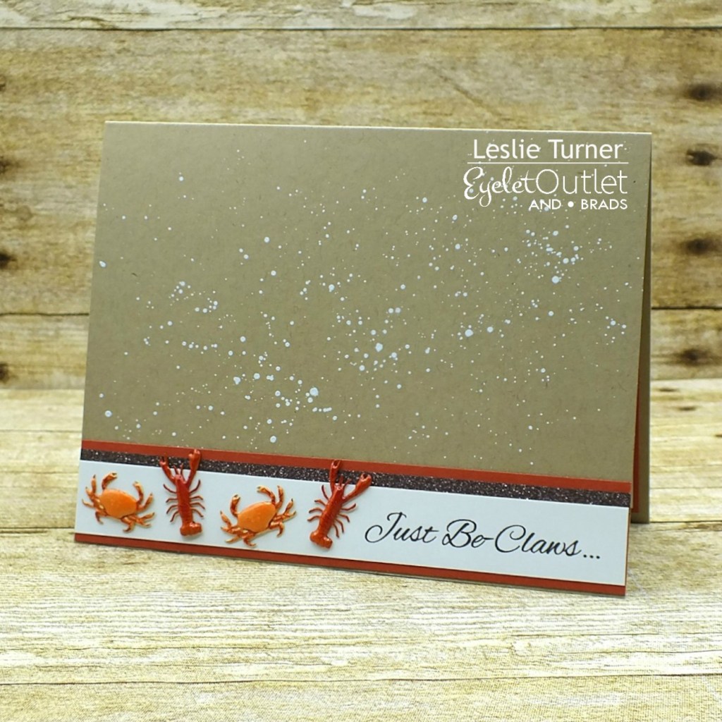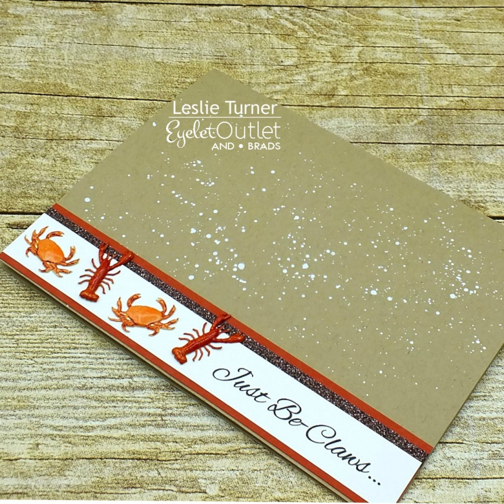 I love super simple designs that pack a punch! I started by splattering white ink across the front of the card base with a fan brush to tie in the white sentiment strip. I created the sentiment on the computer and cut it in a strip, then layered it on orange cardstock which I embellished with a strip of brown Glitter Skinny Washi Tape. I alternated the Crab & Lobster Brads on the left side of the sentiment and then adhered the strip to the card base.