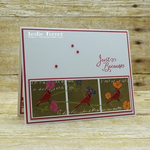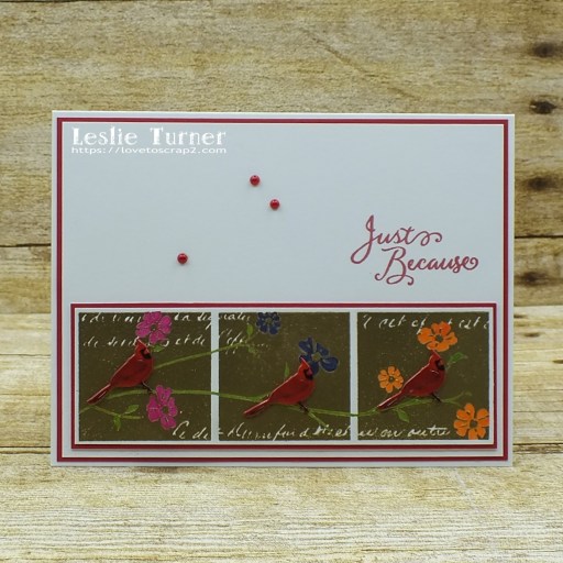 I created a standard A2 size top-folding landscape card base from Neenah Classic Crest 110# Solar White cardstock along with a layering panel for the front which I adhered to a CutCardStock Pop-Tone Wild Cherry cardstock panel. I stamped the 3-Flower Collage image in Versamark and heat embossed it in Ranger Super Fine Detail Gold embossing powder. I trimmed the stamped image, layered it on CutCardStock Pop-Tone Wild Cherry cardstock, and colored the negative spaces of the branches and flowers with fine point Pitt Artist pens, connecting the squares with the branches. I adhered a cardinal brad to each collage square and adhered the panel to the bottom of the card base. I stamped the sentiment in red ink and added three small red flat-back pearls.