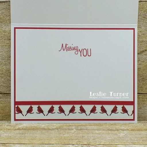 I cut the inside panel from Neenah Classic Crest 80# Solar White cardstock and embellished the bottom of the panel with cardinal washi tape and a narrow strip of CutCardStock Pop-Tone Wild Cherry cardstock cardstock, stamped the sentiment in red ink, and layered the panel on the red cardstock.