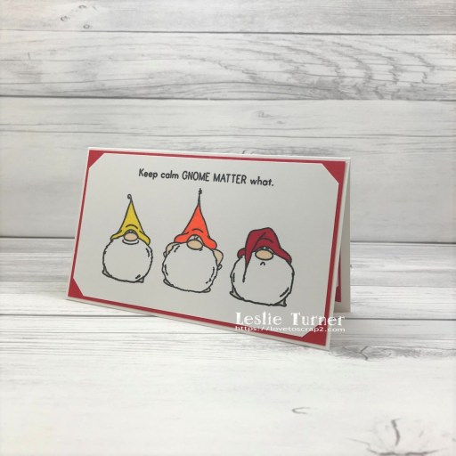 I cut my go-to mini slimline size of 3-1/2″ x 6″ landscape top-folding card base from Neenah Classic Crest 110# Solar White cardstock along with layering panels from CutCardStock Stardream Metallic Jupiter cardstock and Neenah Classic Crest 80# Solar White cardstock. I stamped the three gnomes and sentiment from the Stampingbella Gnomes Have Feelings Too stamp set in Catherine Pooler Midnight ink and colored them with alcohol markers. I clipped the corners with the Tonic Corner Punch and adhered the panel to the red cardstock panel and then to the card base. It doesn’t get much easier than this! ;)