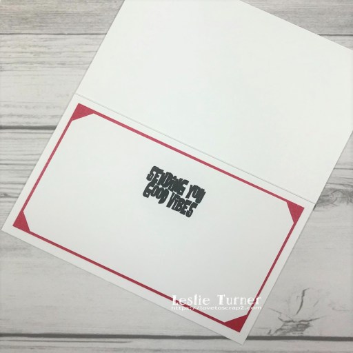 I cut the inside panel from Neenah Classic Crest 80# Solar White cardstock and stamped the sentiment from the Brutus Monroe Groovy Friend stamp set in black ink. I clipped the corners and adhered the panel to a CutCardStock Stardream Metallic Jupiter cardstock layer and then to the inside of the card base.
