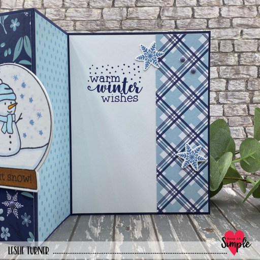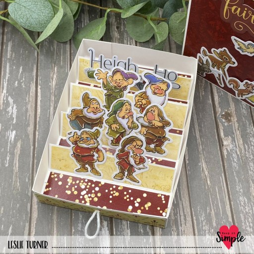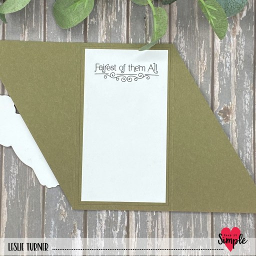 This is a super easy design that is very customizable. It’s as simple as cutting some off the front flap and cutting three squares (turned into diamonds) from that strip. Easy peasy! I cut layering panels from assorted papers in the Here Comes Santa Claus Collection Pack and embellished the squares (diamonds) with die cuts made using KIS Cuts Christmas Sentiments Dies. The center diamond is popped up on one of our Adhesive Basics foam squares. I added a few of our Back To Basics Jade Enamel Dots and the front was finished.