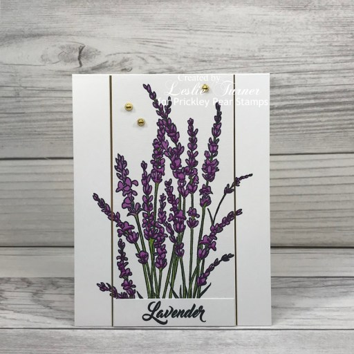 I cut a standard A2 size top-folding card base from 110# Solar White cardstock along with slightly narrower layering panels from Gold Foil cardstock and 80# Basis White cardstock. I stamped the Lavender image in black ink directly on the card base and again on the white cardstock panel. I colored four of the outermost flower spikes on the card base and the entire image on the white cardstock panel. I adhered the colored image to the gold foil panel and then to the card base lining up the flower spikes. I stamped the sentiment in black ink on a white cardstock scrap, trimmed it and adhered it across the bottom. The finishing touch was adding several gold drip drops. The owner has requested that we no longer finish the insides of our Prickley Pear Stamps samples, which feels weird to me but is a huge time-saver, so going forward I’ll be short one photo in my posts. ;)