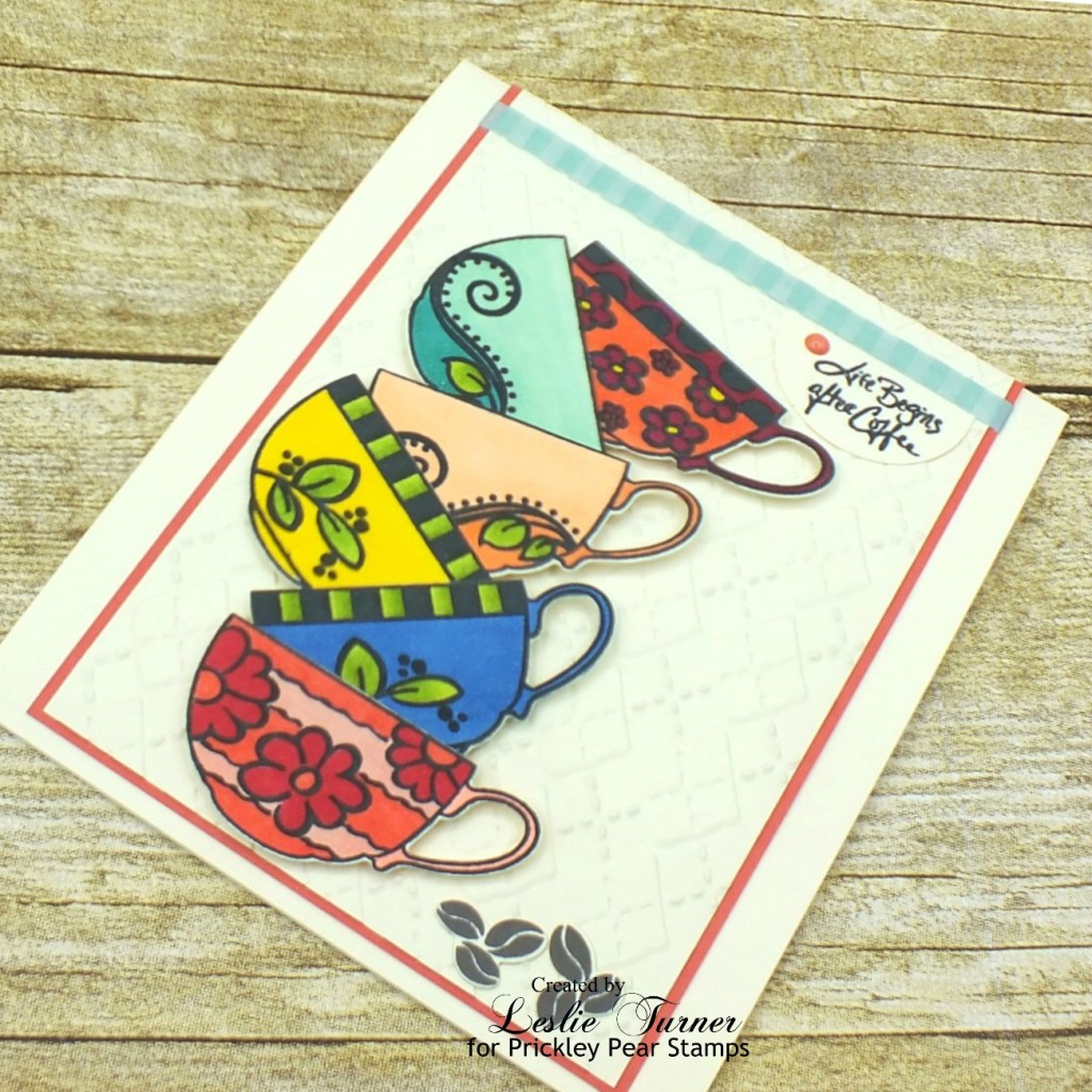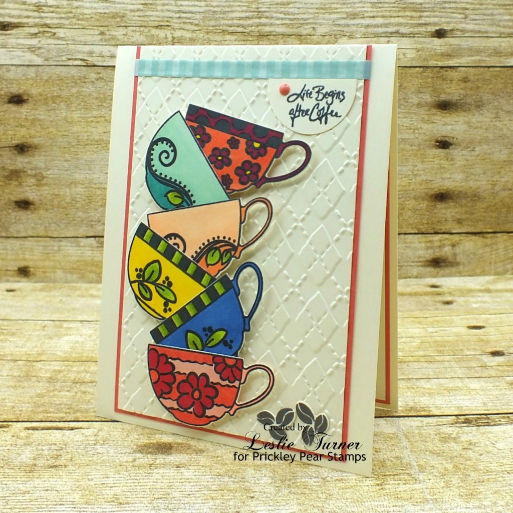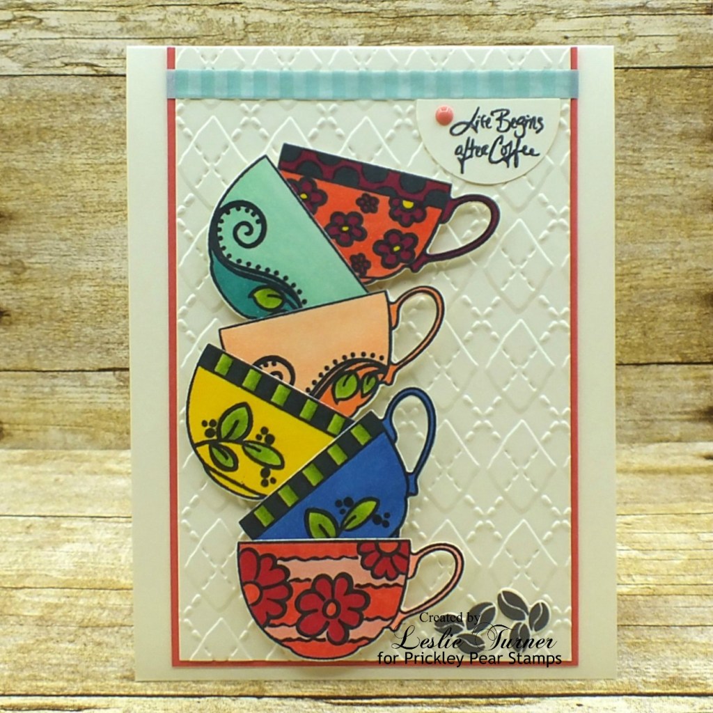 Hi friends! I hope you had a great weekend and your week is off to a fabulous start! Affiliate links are used in this post at no cost to you. I really appreciate your support! Our new challenge at Mix It Up Challenge Blog is live this morning and I’m happy to share my DT inspiration project for MIUCB #50 – Anything Goes + Stamping! Our challenges are always ‘anything goes’ and we offer a technique twist each month just to inspire you! Our twist this month is stamping so we’d love to see your clear/rubber stamps in action! Just remember that the twist is not mandatory to play! I created a fun card for that coffee lover featuring several Prickley Pear Stamps stacked coffee cups in bright colors on a dry embossed ivory background.