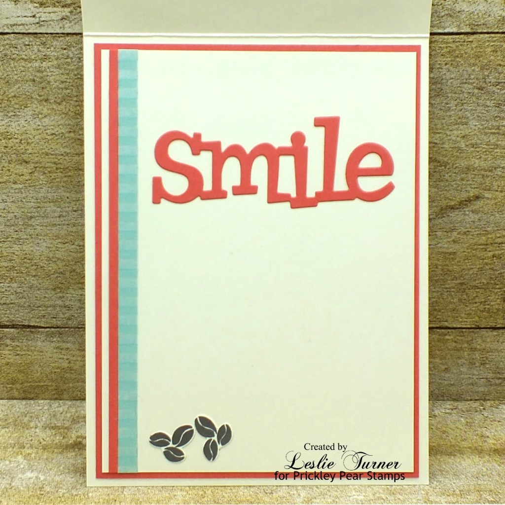 Dies/Punches: Prickley Pear Stamps Coffee Cup die set, Stampin’ Up 1-1/4″ circle punch, The Cat’s Pajamas ‘smile’ die