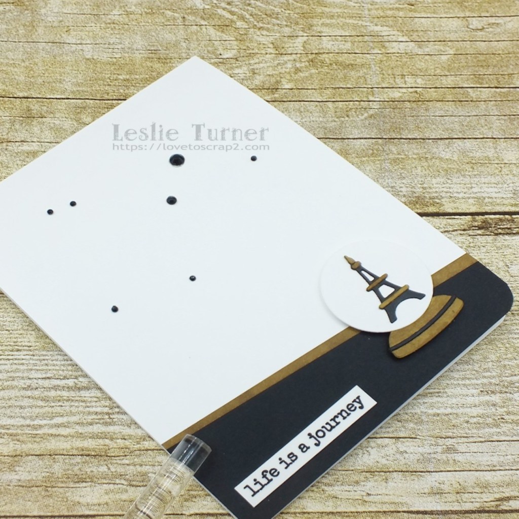 I cut a top folding A2 size card base from Neenah Classic Crest Solar White 110# cardstock and rounded the bottom right corner. I cut a piece of black cardstock at an angle and adhered it to the bottom of the card base. I cut a narrow strip of Neenah Classic Crest Solar White cardstock at a very slight angle, colored it with the tan alcohol marker and adhered it across the top of the black cardstock. I die cut the travel globe pieces from Neenah Classic Crest Solar White cardstock, colored them with tan and black alcohol markers, and assembled it. I applied a STAMPlorations Shine Bright Clear Stickers sentiment to a scrap of white cardstock, trimmed it and adhered it to the bottom left. I adhered the travel globe on foam dimensionals and added several different sizes of black gemstones to complete the front.