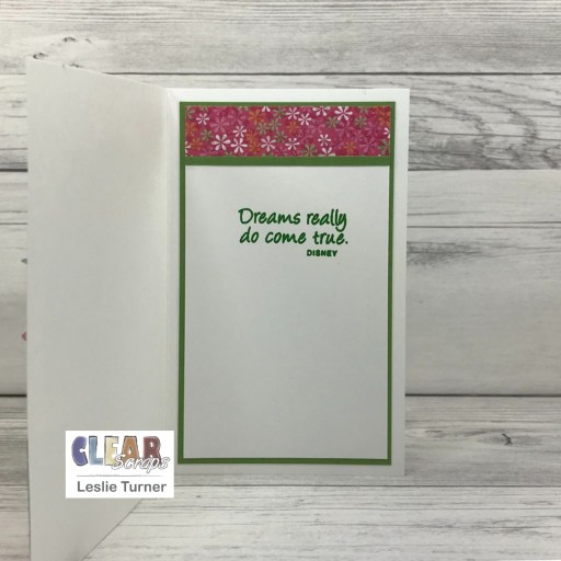 I cut the inside panel from 80# Solar White cardstock and embellished it with the patterned paper used on the front and a narrow strip of green cardstock. I stamped the sentiment in green ink and layered the panel on green cardstock.