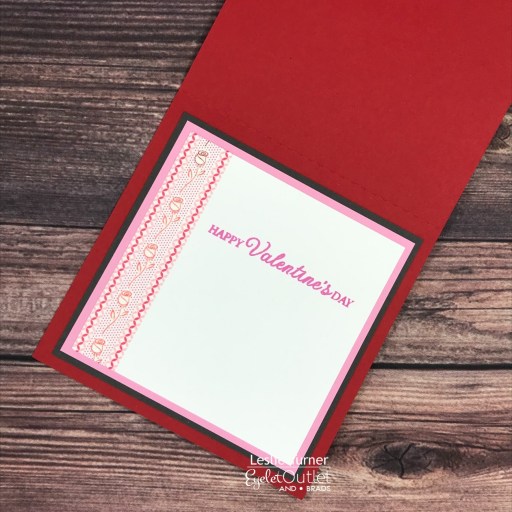 I cut the inside panels from CutCardStock Basis Gray and Pop-Tone Cotton Candy cardstock along with a panel cut from Neenah Classic Crest Solar White which I embellished with more of the Valentine washi tape. I stamped the sentiment from the Hero Arts Year Round Messages stamp set in Catherine Pooler Be Mine ink.
