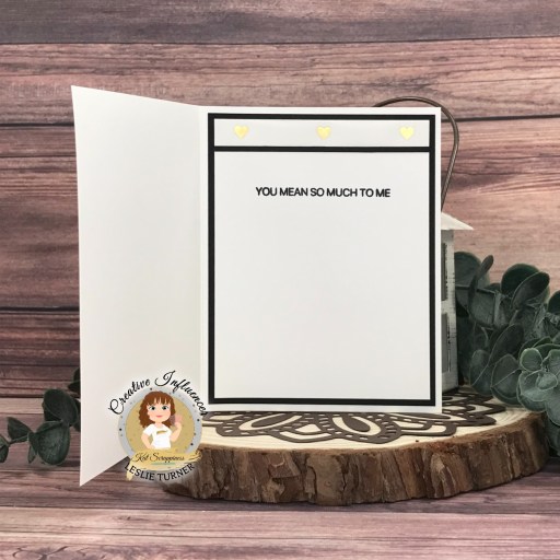 I cut a standard A2 size top-folding landscape card base from Neenah Classic Crest 110# Solar White cardstock along with layering panels from two coordinating prints in the Hot Off The Press Sweet Pea 6×6 double-sided cardstock pack. I die cut the large sentiment into the floral cardstock using the Love You dies and reserving the negative spaces on the two heart Os and the E. I adhered a piece of Grafix Craft Plastic behind the apertures and added 1/2″ double-sided foam strips to the back of the panel.