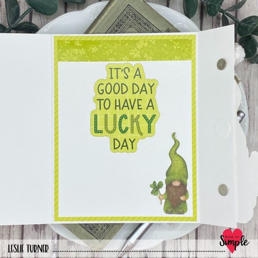 I cut the 4″ x 5-1/4″ inside panel from 80# Solar White cardstock and embellished it with a leftover strip of the floral paper used on the front. I added a sentiment and a tiny gnome, also from the die cut pieces, and layered the panel on another print from the Lucky Day Collection.